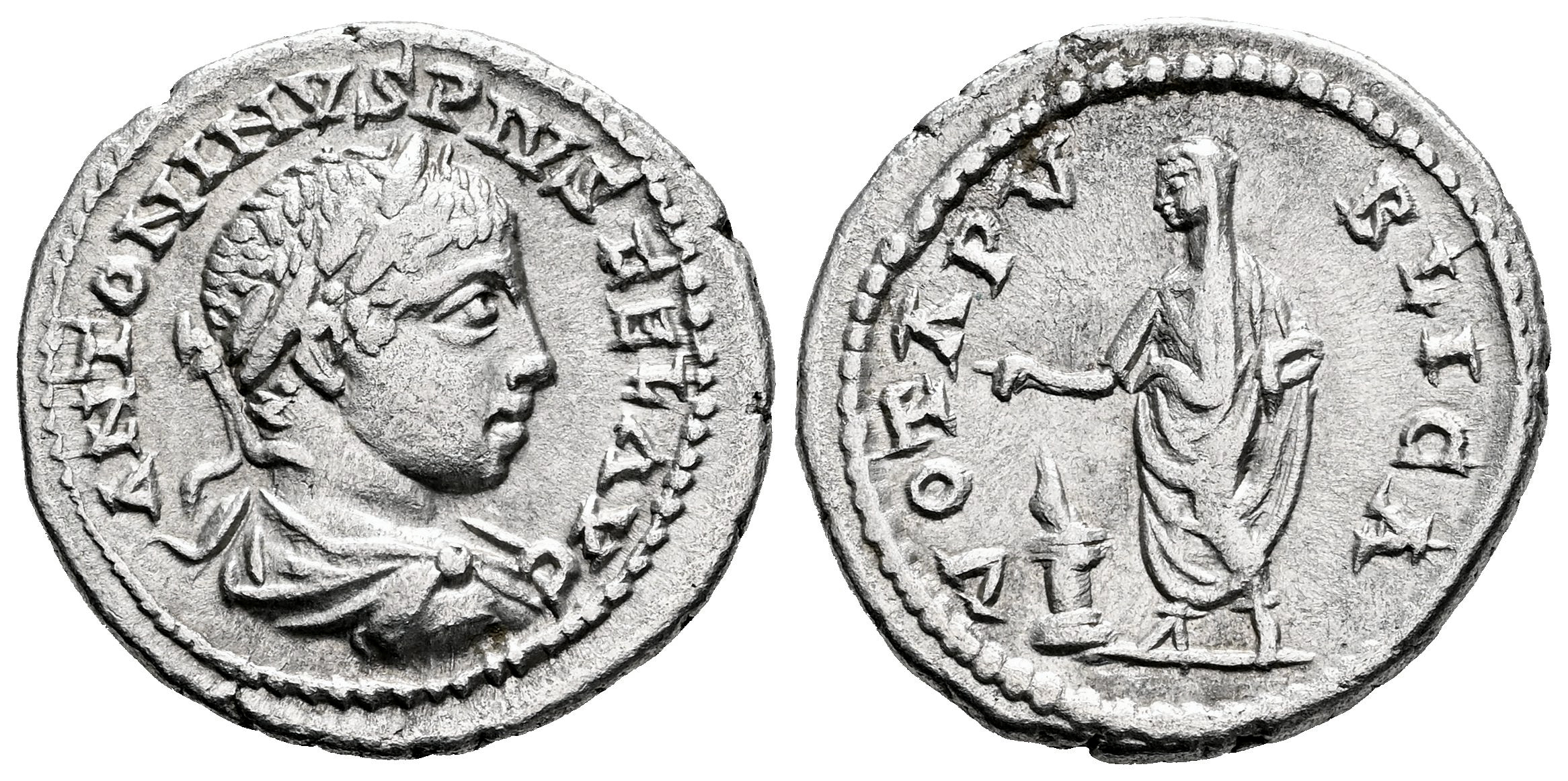 Eliogábalo. Denario. 218-222 d.C. Antioquía. (Ric-IV 202). (Bmcre-291). (Tesorillo-Heliogábalo 20, mismo ejemplar). Anv.: ANTONINVS PIVS FEL AVG. Busto laureado, drapeado y con coraza a la derecha. Rev.: VOTA PVBLICA. Emperador en pie a la izquierda, sacrificando desde una patera sobre un altar en llamas. Ae. 3,29 g. Ex Ancient Delights, actualmente Mayor 25. Convención de Madrid (Diciembre 2005). MBC+. Est...100,00.