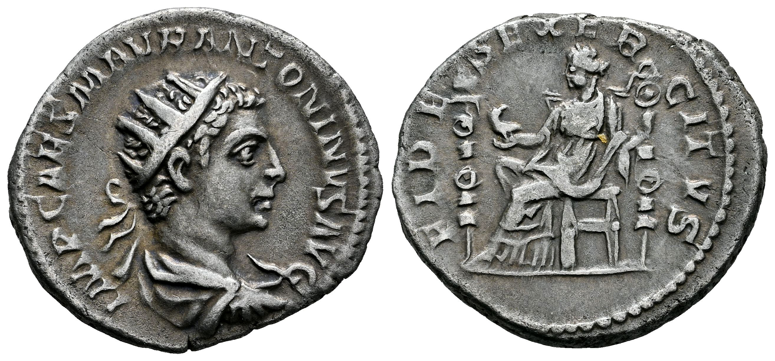 Eliogábalo. Antoniniano. 218-222 d.C. Roma. (Ric-IV 67). (Bmcre-107). (Tesorillo-Heliogábalo 1, mismo ejemplar). Anv.: IMP CAES ANTONINVS AVG. Busto radiado y drapeado a la derecha. Rev.: FIDES EXERCITVS. Fides sedente a la izquierda, sosteniendo águila y estandarte; estandarte delante. Ag. 4,75 g. Ex Ancient Delights, actualmente Mayor 25. (Marzo 2004). MBC+. Est...80,00.