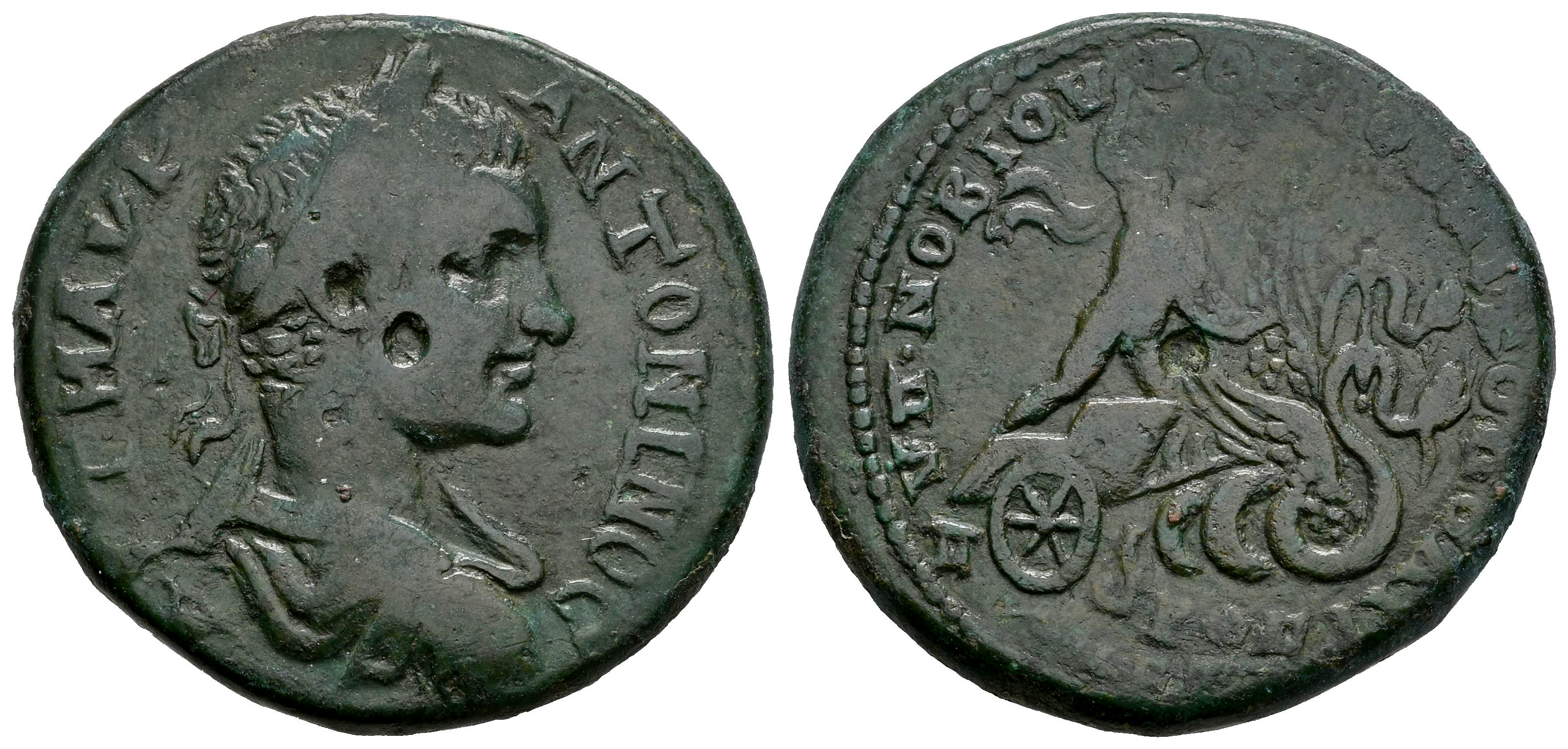 Eliogábalo. Moesia Inferior. Tetrassarion. 218-222 d.C. Nicopolis e Istrum. Novius Rufus, legado consular. (Varbanov-3911). (Hristova/Jekov-8.26.23.3). (Tesorillo-Heliogábalo 25, mismo ejemplar). Anv.: ΑΥΤ Μ ΑΥΡ ΑΝΤΟΝΙΝΟC. Busto laureado de Heliogábalo, drapeado y con coraza a la derecha. Rev.: ΥΠ ΝΟΒΙΟΥ ΡΟΥΦΟΥ NIKOΠΟΛIT / ΠPOC / ICT. Triptolemos conduciendo biga de serpientes aladas hacia la derecha, esparciendo semillas. Ae. 11,76 g. MBC/MBC-. Est...120,00.