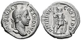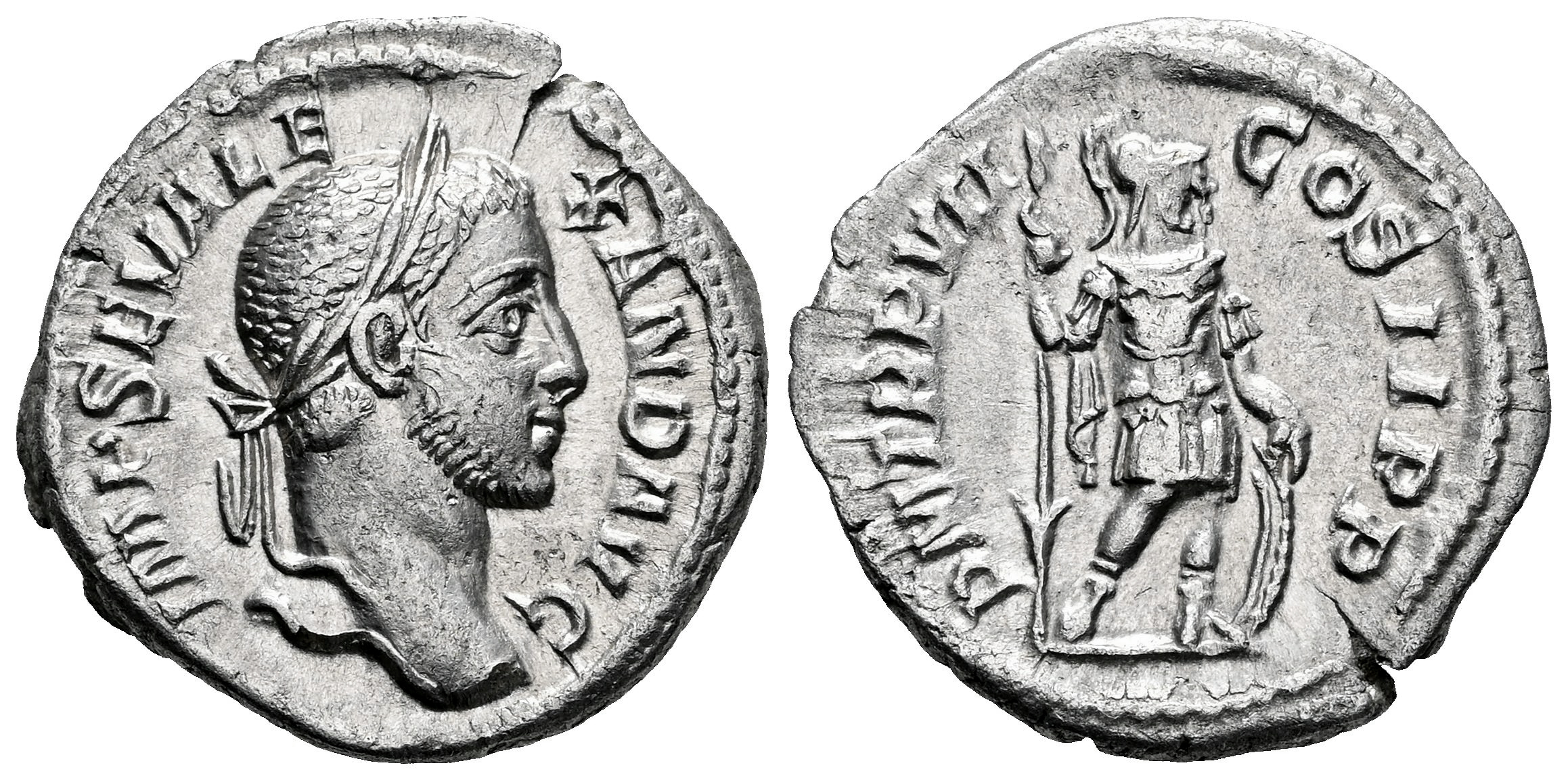 Alejandro Severo. Denario. 228 d.C. Roma. (Ric-IV 83). (Bmcre-503). (Tesorillo-A. Severo 27, mismo ejemplar). Anv.: IMP SEV ALEXAND AVG. Cabeza laureada a la derecha. Rev.: P M TR P VII COS II P P. Marte en pie a la derecha, sosteniendo lanza y escudo. Ag. 3,38 g. MBC+. Est...90,00.