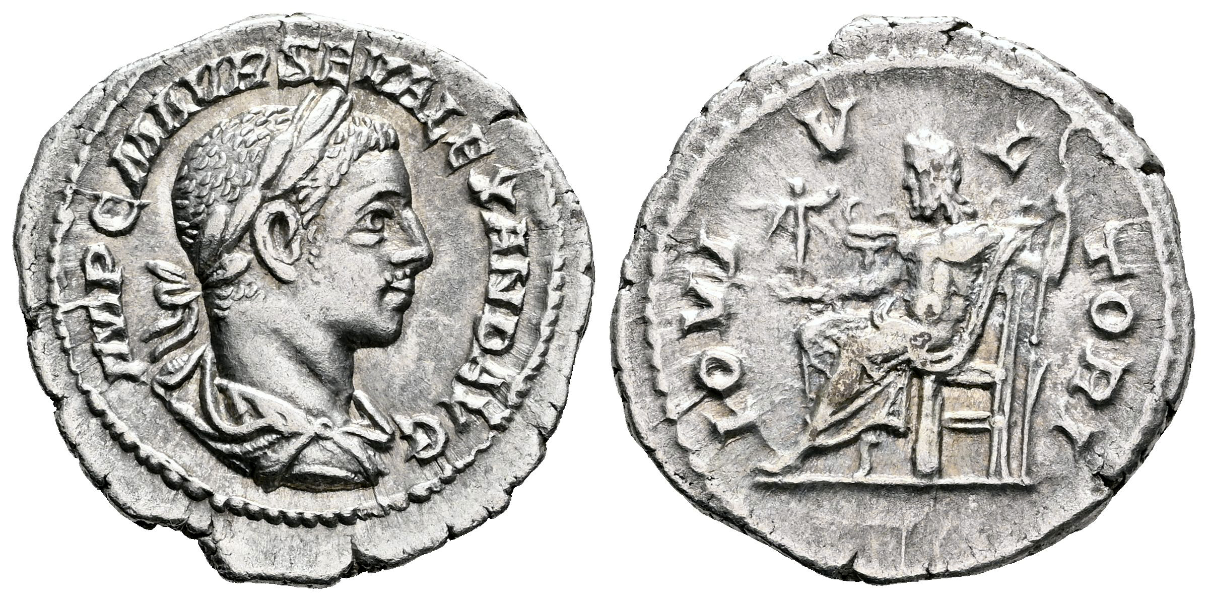 Alejandro Severo. Denario. 222-228 d.C. Roma. (Ric-IV 144). (Bmcre-233). (Tesorillo-A. Severo 13, mismo ejemplar). Anv.: IMP C M AVR SEV ALEXAND AVG. Busto laureado y drapeado a la derecha. Rev.: IOVI VLTORI. Júpiter sedente a la izquierda, sosteniendo una Victoria y una lanza invertida? o un cetro?. Ag. 3,20 g. Ex Ancient Delights, actualmente Mayor 25. Convención de Madrid (Septiembre 2004). EBC-/MBC+. Est...120,00.
