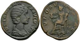Julia Mamaea. Sestercio. 222-235 d.C. Roma. (Ric-IV 683). (Bmcre-759). (Tesorillo-J. Mamea 1, mismo ejemplar). Anv.: IVLIA MAMAEA AVGVSTA. Busto con diadema y drapeado a la derecha. Rev.: IVNO AVGVSTAE. Juno sedente a la izquierda, sosteniendo una flor y un bebé con ropajes infantiles; SC en exergo. Ae. 21,47 g. MBC+/MBC. Est...120,00.