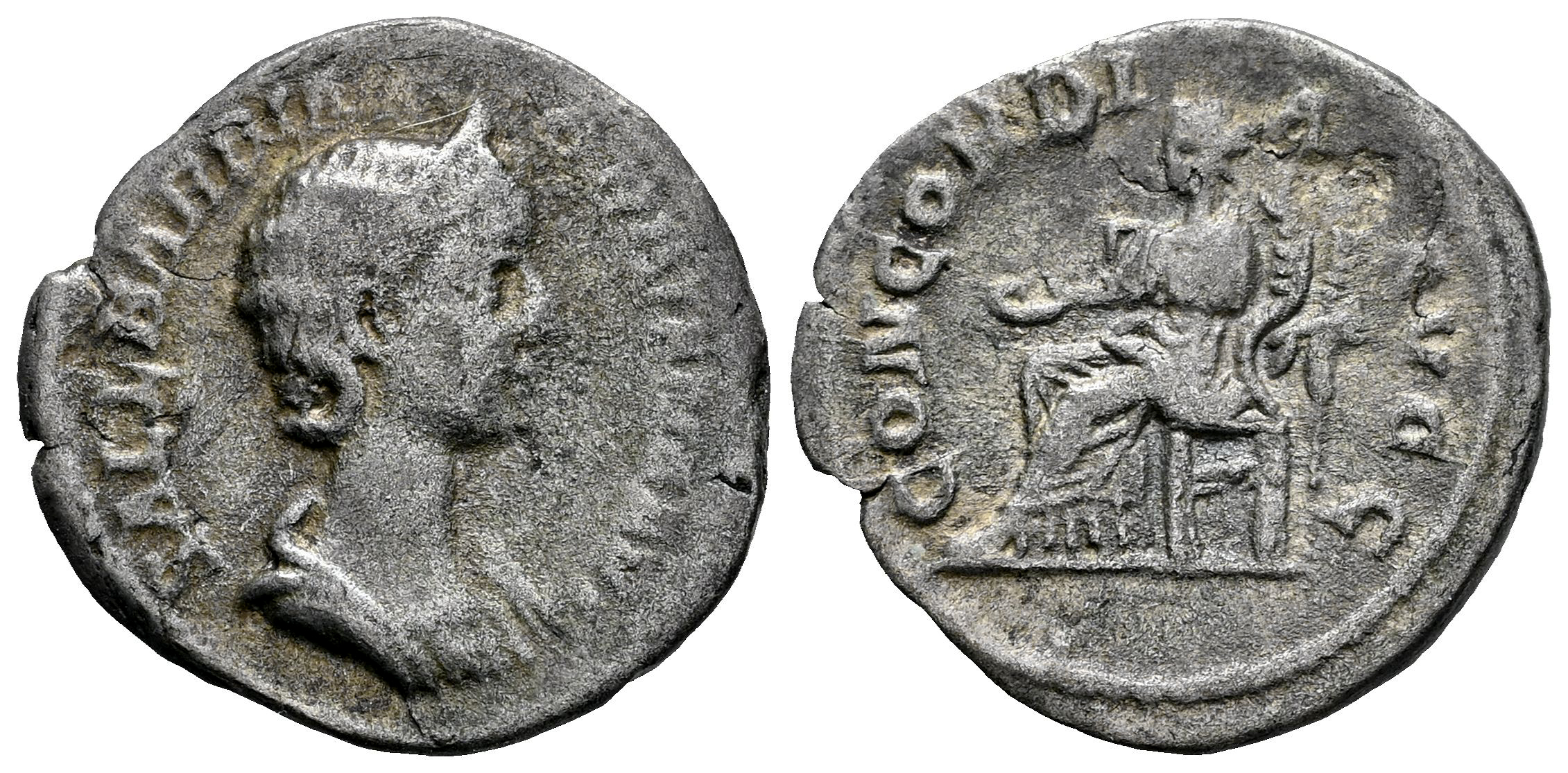 Orbiana. Denario. 225-227 d.C. Roma. (Ric-IV 319). (Bmcre-287). (Tesorillo-Orbiana 2, mismo ejemplar). Anv.: SALL BARBIA ORIBANA AVG. Busto drapeado a la derecha, vistiendo stephane. Rev.: CONCORDIA AVGG. Concordia sedente a la izquierda, sosteniendo pátera y cornucopias dobles. Ag. 2,19 g. Ex Ancient Delights, actualmente Mayor 25. Convención de Madrid (Septiembre 2004). BC+/MBC-. Est...160,00.