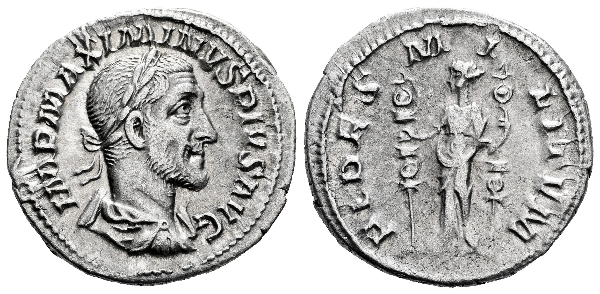 Maximino I. Denario. 235-236 d.C. Roma. (Ric-IV 7a). (Bmcre-1). (Tesorillo-Maximino 2, mismo ejemplar). Anv.: IMP MAXIMINVS PIVS AVG. Busto laureado, drapeado y con coraza a la derecha. Rev.: FIDES MILITVM. Fides en pie de frente, mirando a la izquierda, sosteniendo un estandarte militar en cada mano. Ag. 2,87 g. Ex Ancient Delights, actualmente Mayor 25. Convención de Madrid (Enero 2006). MBC+. Est...90,00.
