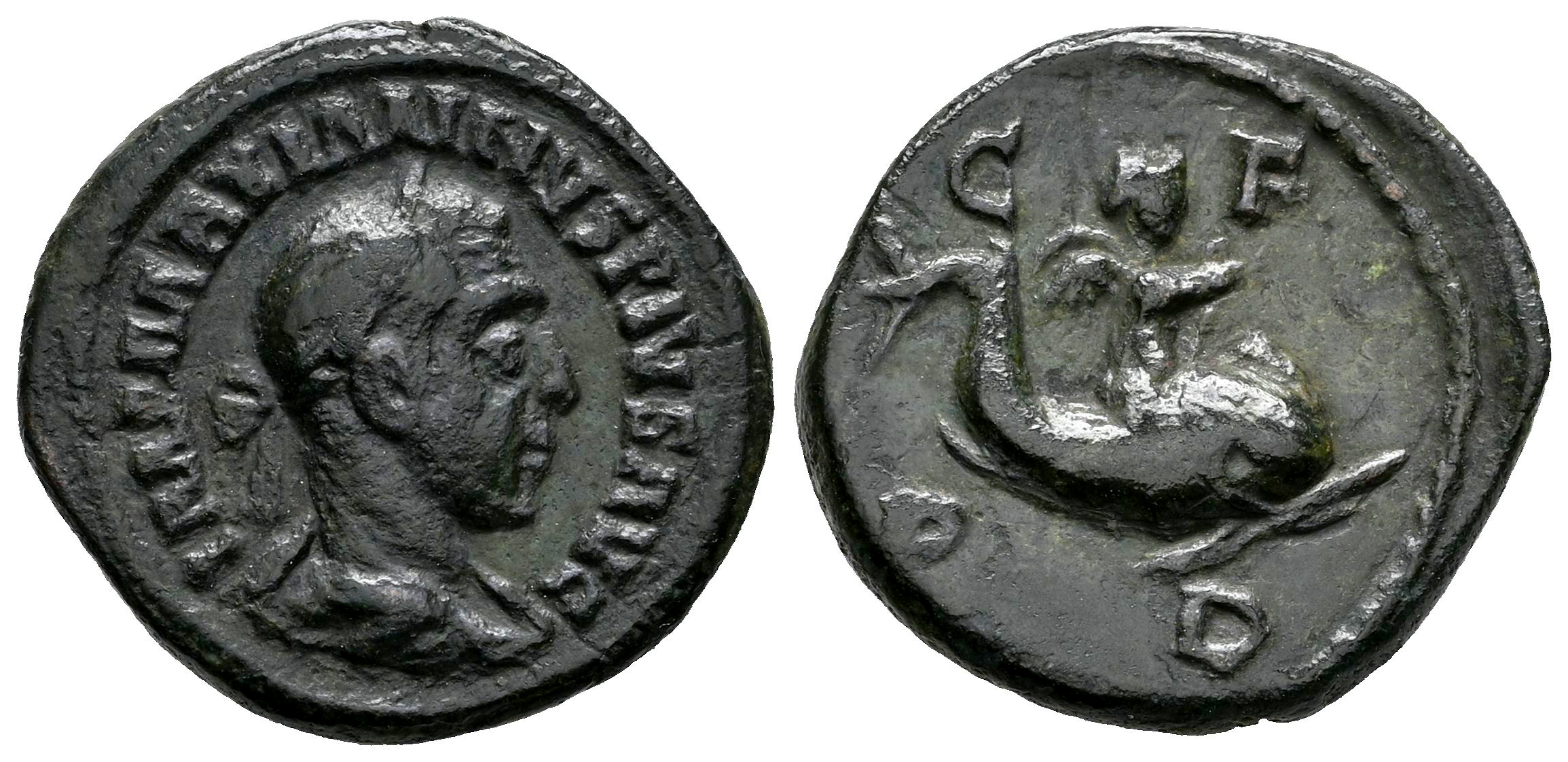 Maximino I. Tracia. AE 19. 235-238 d.C. Deultum. (Varbanov-2434). (Tesorillo-Maximino I 9, mismo ejemplar). Anv.: IMP MAXIMINVS PIVS AVG. Busto laureado, drapeado y con coraza a la derecha. Rev.: C F P D, Cupido cabalgando sobre un delfín a la derecha. Ae. 4,26 g. Rara. La leyenda del reverso de esta moneda es una abreviatura de «Colonia Flavia Pacensis Deultum». Dicha Colonia, Deultum, fue fundada por Vespasiano. MBC/MBC+. Est...100,00.