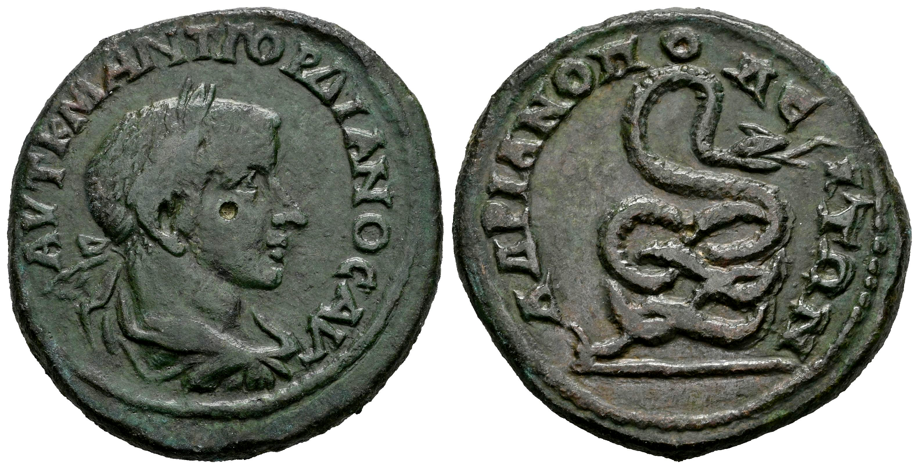 Gordiano III. Tracia. AE 27. 238-244 d.C. Hadrianopolis. (Varbanov-3846). (Sng Cop-589). (Tesorillo-Gordiano III 49, mismo ejemplar). Anv.: AVT K M ANT ΓOPΔIANOC AVΓ. Busto laureado, drapeado y con coraza hacia la derecha. Rev.: AΔPIANOΠOΛEITΩN. Serpiente enroscada, cabeza erguida hacia la derecha. Ae. 11,22 g. MBC/MBC+. Est...80,00.