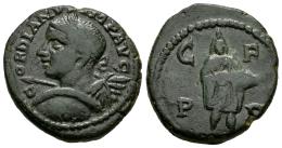 Gordiano III. Tracia. AE 18. 238-244 d.C. Deultum. (Jurukova-p. 110, 310). (Tesorillo-Gordiano III 57, mismo ejemplar). Anv.: GORDIANVS IMP AVG. Busto laureado, drapeado y con coraza a la izquierda, portando lanza y escudo. Rev.: C F P D, Telesphoros en pie de frente. Ae. 4,18 g. Rara. MBC. Est...100,00.