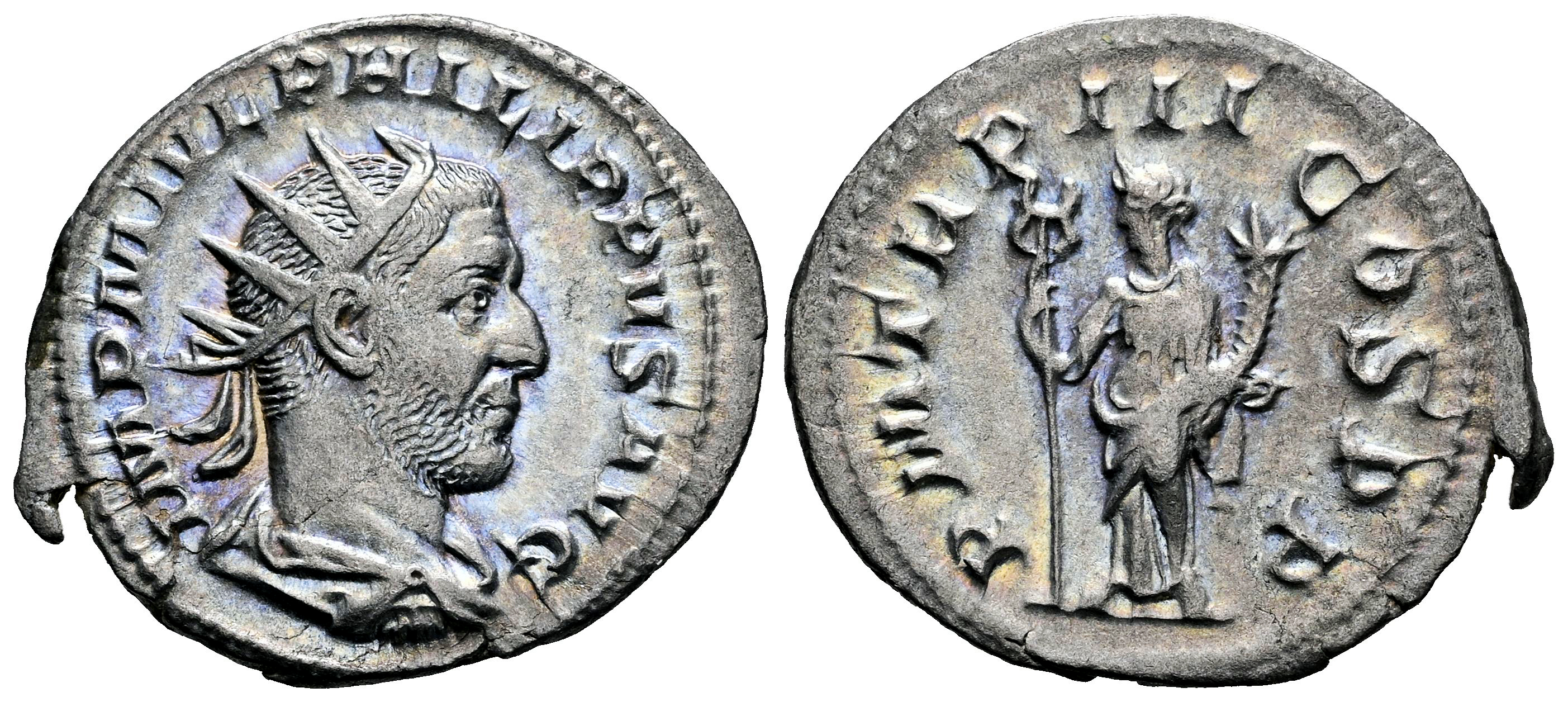 Filipo I. Antoniniano. 244-249 d.C. Roma. (Ric-IV 3). (Tesorillo-Filipo I 14, mismo ejemplar). Anv.: IMP M IVL PHILIPPVS AVG. Busto radiado y con coraza a la derecha. Rev.: PM TR P III COS P P. Felicitas en pie a la izquierda sosteniendo un caduceo y una cornucopia. Ag. 3,51 g. Ligero tono iridiscente. Atractiva. Ex J. Vico 126 (09/06/2011), lote 335. EBC-/MBC+. Est...80,00.