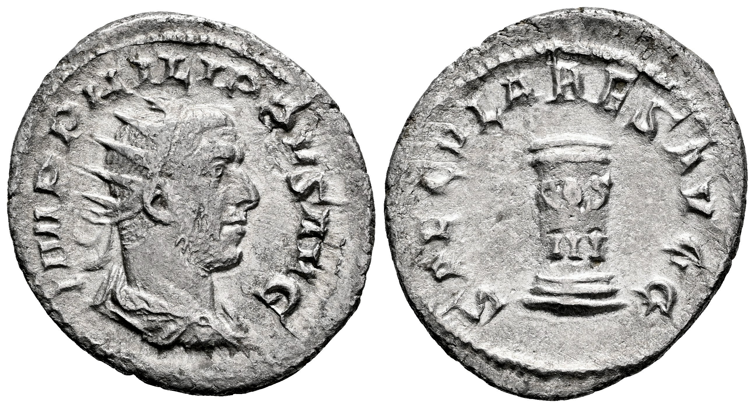 Filipo I. Antoniniano. 248 d.C. Roma. (Ric-IV 24c). (Rsc-193). (Tesorillo-Filipo I 18, mismo ejemplar). Anv.: IMP PHILIPPVS AVG. Busto radiado, drapeado y con coraza a la derecha. Rev.: SAECVLARES AVGG. Columna baja con la inscripción COS III en dos líneas. Ag. 3,68 g. Ex Ancient Delights, actualmente Mayor 25. (Diciembre 2002). MBC. Est...80,00.