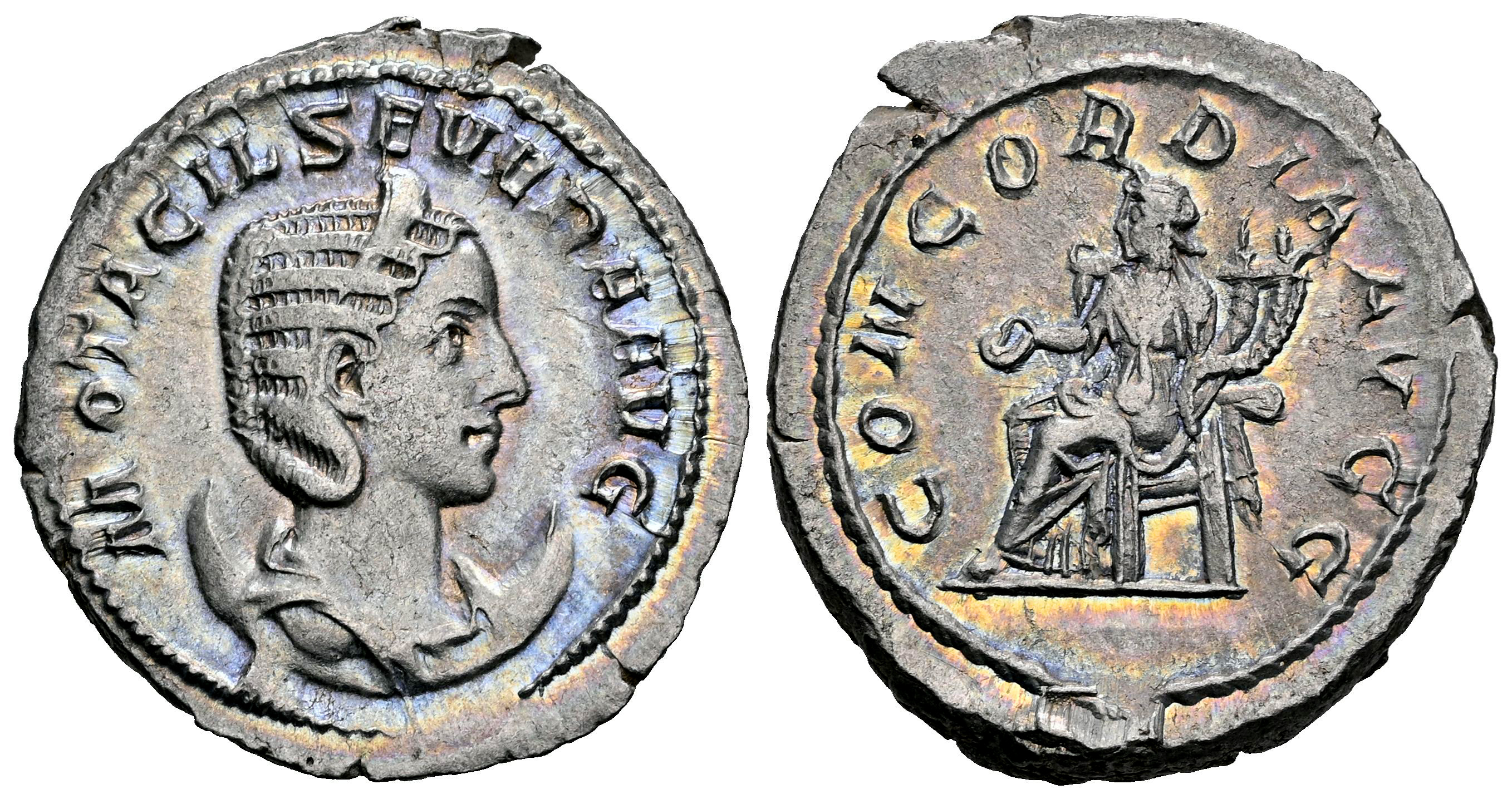 Otacilia Severa. Antoniniano. 246-248 d.C. Roma. (Ric-IV 125c). (Rsc-4). (Tesorillo-Otacilia 3, mismo ejemplar). Anv.: M OTACIL SEVERA AVG. Busto con diadema y drapeado a la derecha, situado sobre creciente. Rev.: CONCORDIA AVGG. Concordia sedente a la izquierda, sosteniendo pátera y cornucopias dobles. Ag. 5,18 g. Suave pátina con precioso tono iridiscente. Muy bella. Ex J. Vico 126 (09/06/2011), lote 2011. EBC-. Est...120,00.
