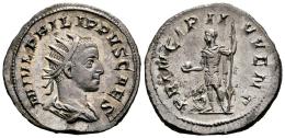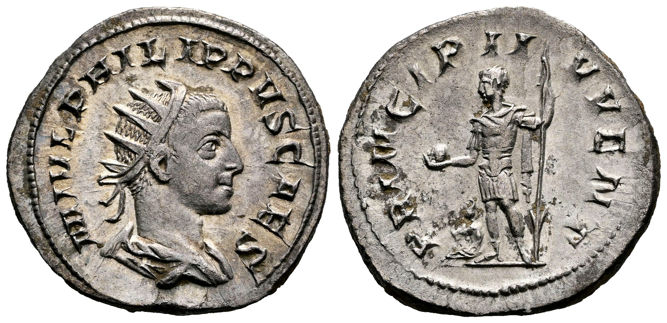 Filipo II. Antoniniano. 244-246 d.C. Roma. (Ric-IV 219). (Rsc-57). (Tesorillo-Filipo II 9, mismo ejemplar). Anv.: M IVL PHILIPPVS CAES. Busto radiado, drapeado y con coraza a la derecha. Rev.: PRINCIPI IVVENT. Príncipe en pie a la izquierda, sosteniendo un globo y una lanza, cautivo a los pies. Ag. 3,24 g. Ex Ancient Delights, actualmente Mayor 25. Convención de Madrid (Febrero 2005). MBC+. Est...60,00.