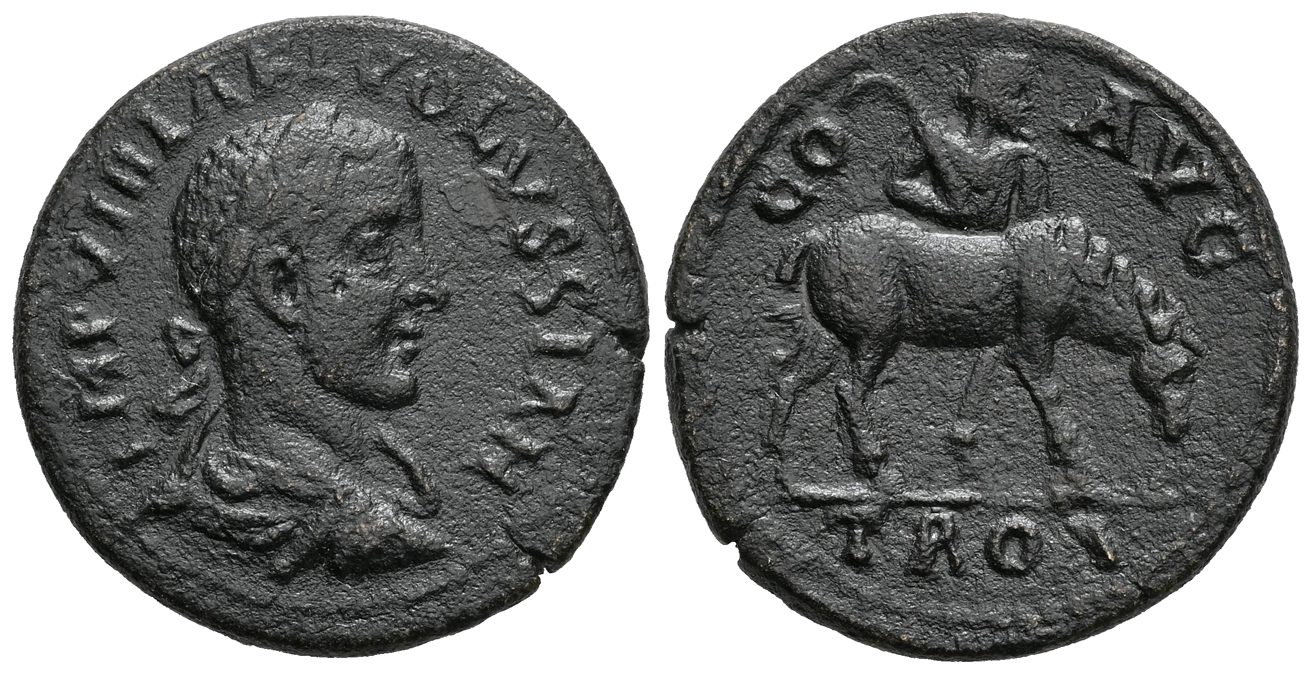Volusiano. AE 22. 251-253 d.C. Alejandría. Troas. (RPC-IX 457). (Bellinger-A422). (Tesorillo-Volusiano 4, mismo ejemplar). Anv.: IMP VIBI AFI VOLVSSIAN. Busto laureado, drapeado y con coraza a la derecha. Rev.: COL AVG. Caballo pastando a la derecha, pastor (Ordes) en pie justo detrás, sosteniendo un pedum; TROA en exergo. Ae. 5,98 g. Ex Ancient Delights, actualmente Mayor 25. Convención de Madrid (Junio 2007). MBC/MBC+. Est...80,00.