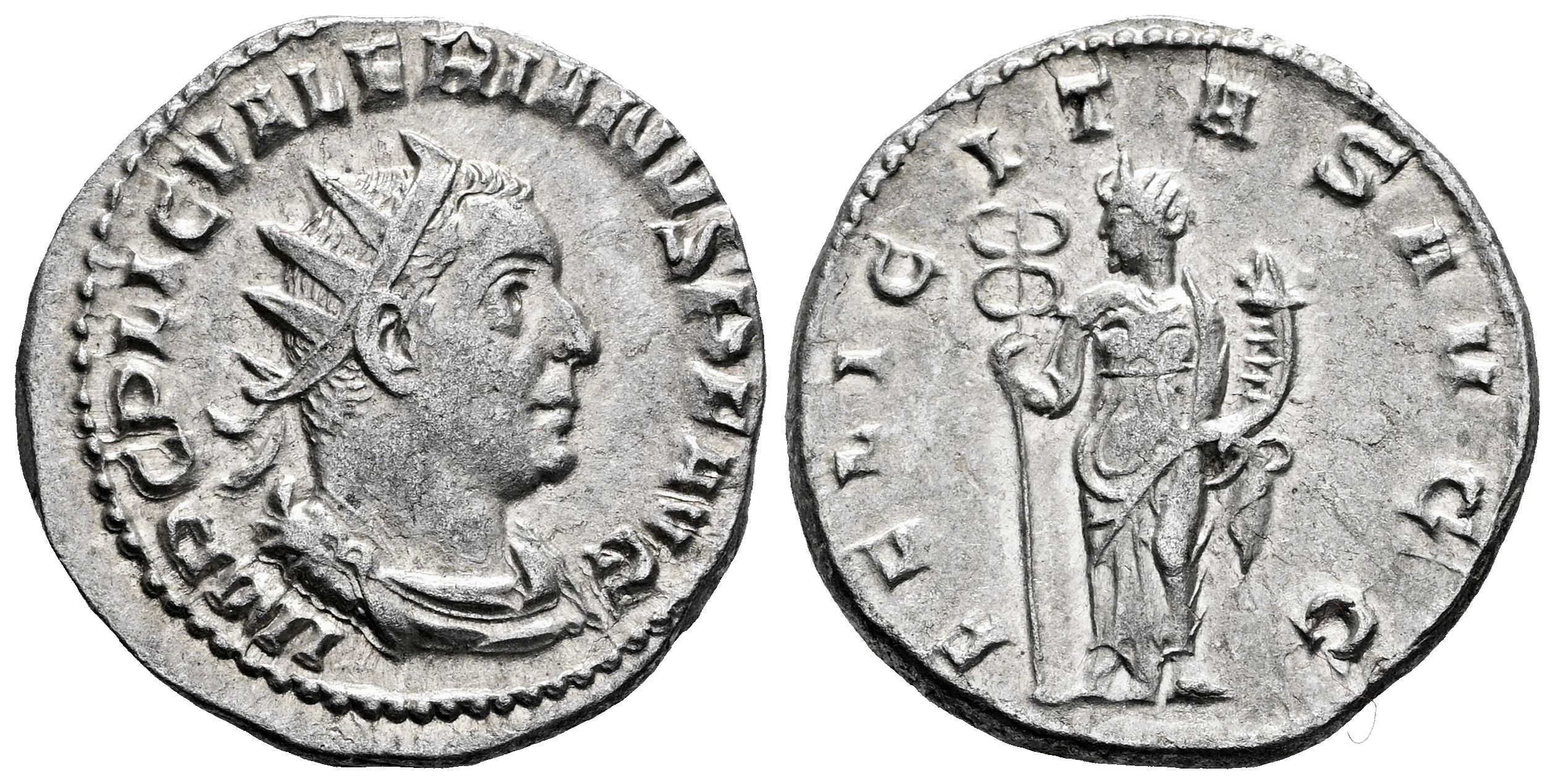 Valeriano I. Antoniniano. 253-260 d.C. Roma. (Ric-87). (MIR-73c). (Tesorillo-Valeriano I 2, mismo ejemplar). Anv.: IMP C P LIC VALERIANVS P F AVG. Busto drapeado, radiado y con coraza a la derecha. Rev.: FELICITAS AVGG. Felicitas en pie a la izquierda, sosteniendo una cornucopia y un caduceo. Ag. 4,20 g. Restos de brillo original. Ex Cayón(06/02/2009), lote 6649. Conserva la etiqueta original. MBC+/EBC-. Est...80,00.