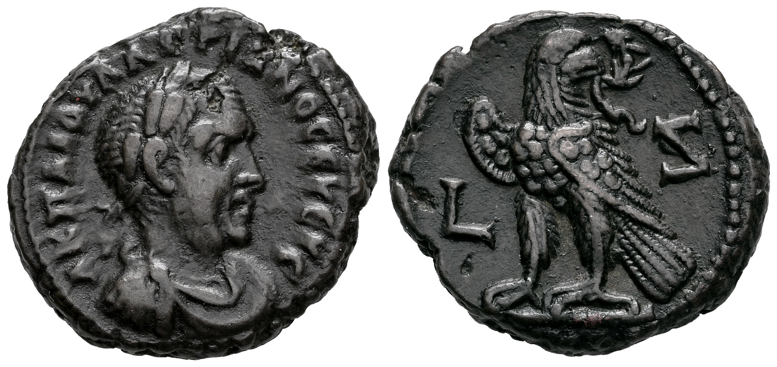 Valeriano I. Tetradracma. RY 7 = 259/60 d.C. Alejandría. Egipto. (Dattari-Savio 5222 var.). (Emmett-3728.7 var.). (Tesorillo-Valeriano I 10, mismo ejemplar). Anv.: A K Π ΛI OVAΛЄPIANOC ЄV ЄVC. Busto laureado, drapeado y con coraza, a la derecha. Rev.: Águila en pie a la izquierda, cabeza a la derecha, con corona en el pico; L - Z (invertida) a través de los campos. Ve. 10,01 g. No hemos encontrado referencias para la variante Z invertida en el reverso, si presentan dicha variedad Emperadores coetáneos. Rara. Ex Cayón (Marzo 2005). MBC+/EBC-. Est...80,00.
