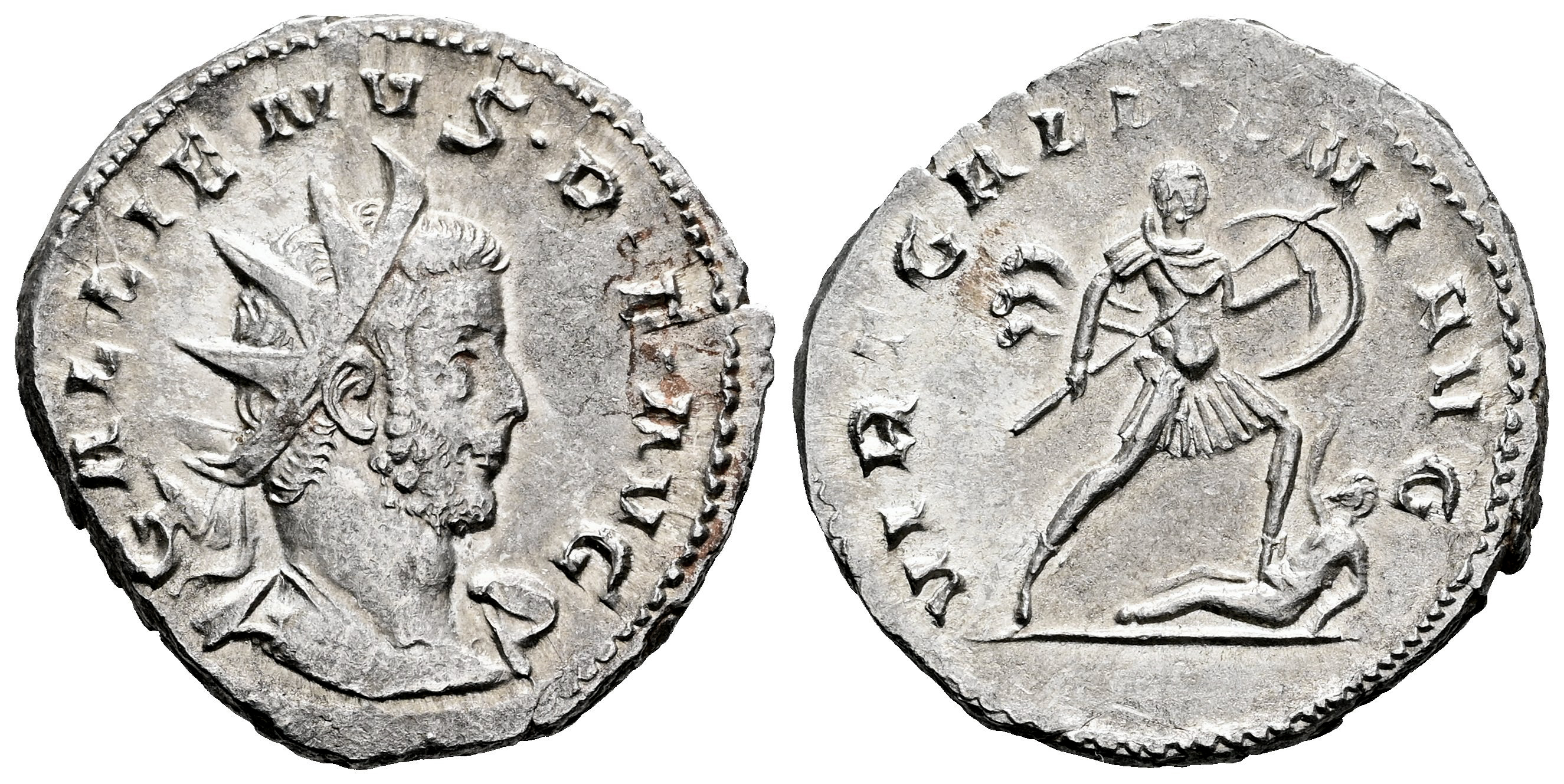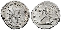 Galieno. Antoniniano. 257-260 d.C. Colonia Agrippinensis. (Ric-V 1 54). (MIR-890h). (Tesorillo-Galieno 48, mismo ejemplar). Anv.: GALLIENVS · P · F · AVG. Busto radiado y con coraza, mirando a la derecha. Rev.: VIRT GALLIENI AVG. Emperador avanzando hacia la derecha, con cetro transversal y escudo redondo, pisando a un enemigo caído a sus pies. Ag. 3,87 g. Ex J. Vico 127 (10/11/2011), lote 3367. Conserva la etiqueta original. MBC+/EBC. Est...70,00.