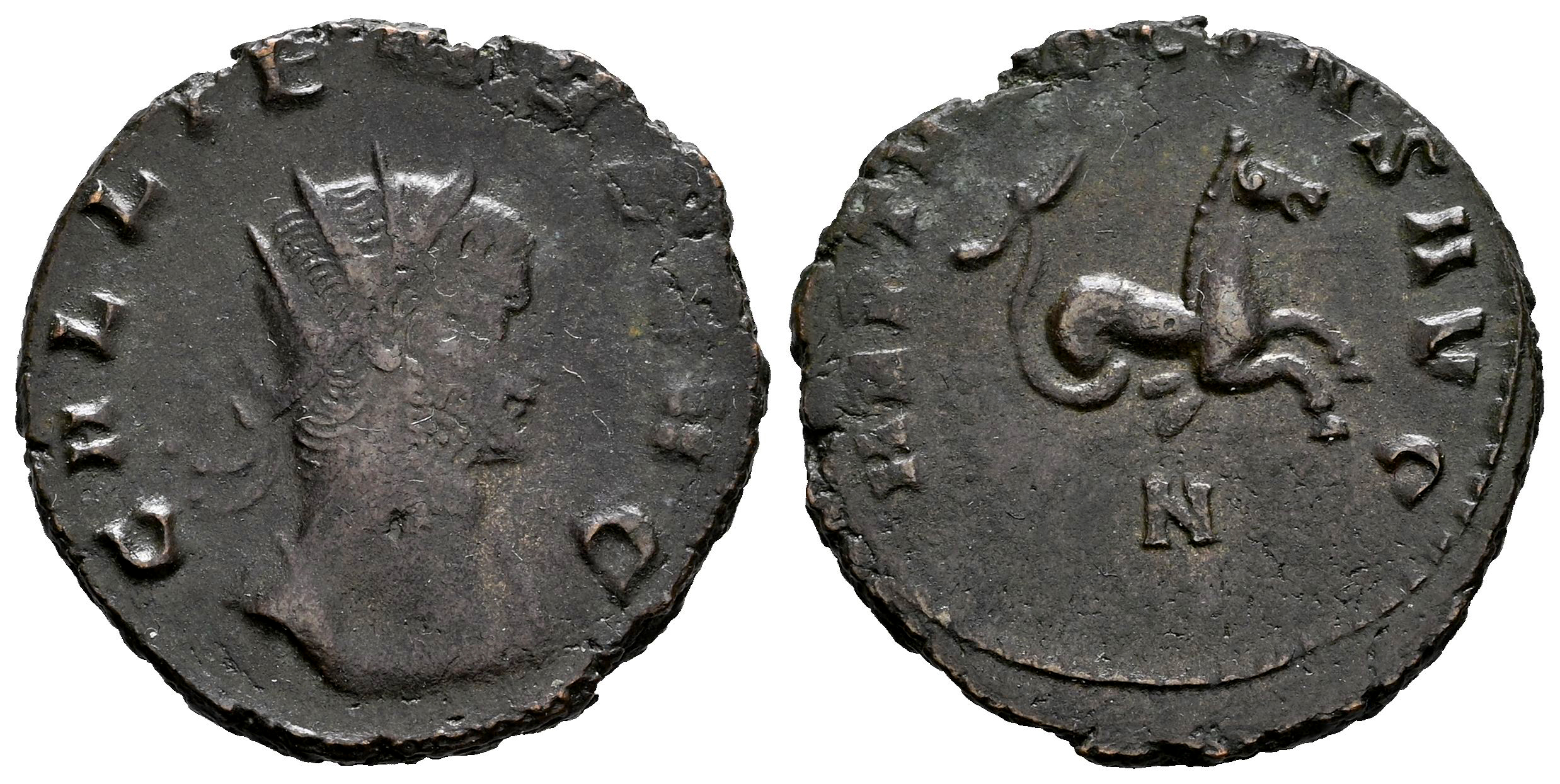 Galieno. Antoniniano. 267-268 d.C. Roma. (Ric-V 1 245). (MIR-743b). (Tesorillo-Galieno 30, mismo ejemplar). Anv.: GALLIENVS AVG. Busto radiado y con coraza, mirando a la derecha. Rev.: NEPTV(N)O CONS AVG. Hipocampo a la derecha; N en exergo. Ve. 3,87 g. Ex J. Vico 103 (13/11/2003), lote 226. MBC-/MBC+. Est...50,00.