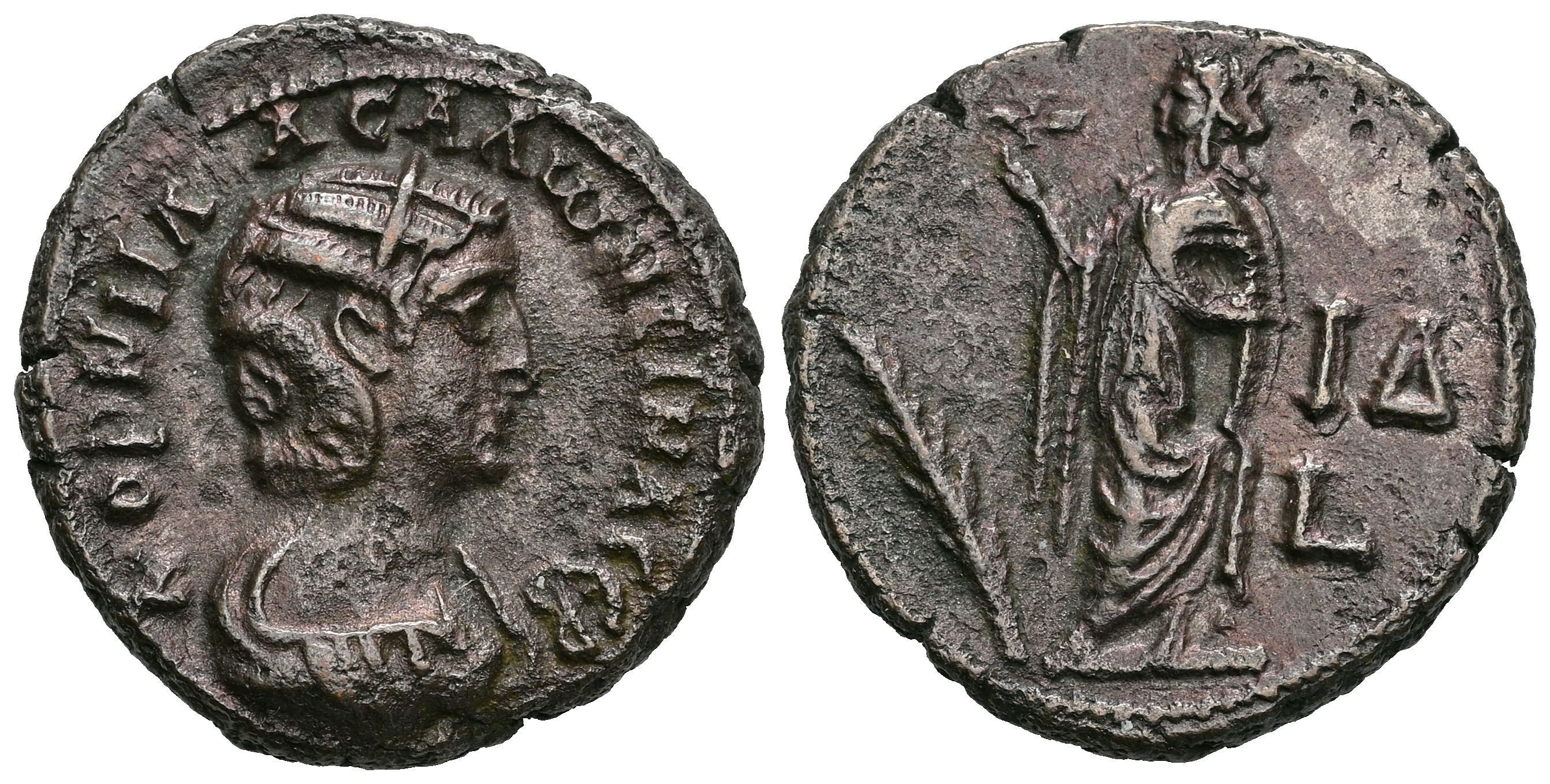 Salonina. Tetradracma. RY 14 = 266/7 d.C. Alejandría. Egipto. (Dattari-Savio 5333). (Emmett-3856). (Tesorillo-Salonina 7, mismo ejemplar). Anv.: KOPNHΛIA CAΛѠNЄINA CЄB. Busto drapeado a la derecha, con stephane. Rev.: Elpis en pie a la izquierda, sosteniendo una flor y alzando el dobladillo de su vestido, con una palma delante; LIΔ (fecha) en el campo derecho. Ve. 7,62 g. Ex Cayón (29/11/2004), lote 807. Conserva la etiqueta original. MBC/MBC+. Est...60,00.
