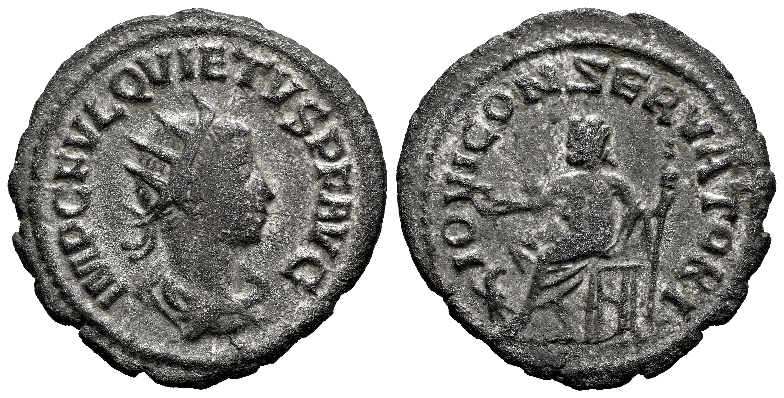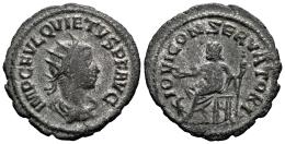 Quieto. Antoniniano. 260-261 d.C. Samosata. (Ric-V 2 6). (MIR-1735n). (Tesorillo-Quieto 1, mismo ejemplar). Anv.: IMP C FVL QVIETVS P F AVG. Busto radiado, drapeado y coraza, mirando a la derecha. Rev.: IOVI CONSERVATORI. Júpiter sedente a la izquierda, con patera y cetro; águila a sus pies, estrella en el campo izquierdo. Ve. 3,14 g. MBC. Est...90,00.