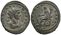 Aureliano. Antoniniano. 270-275 d.C. Mediolanum. (Ric-V 1 128). (MER/RIC-1473). (Tesorillo-Aureliano 8, mismo ejemplar). Anv.: IMP AVRELIANVS AVG. Busto radiado y con coraza a la derecha. Rev.: FORTVNA REDVX. Fortuna sedente a la izquierda sobre rueda, portando timón y cornucopia; Q en exergo. Ve. 3,84 g. Escasa. EBC-/MBC+. Est...60,00.