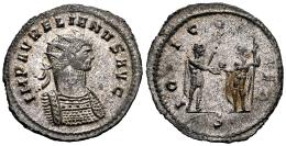 Aureliano. Antoniniano. 270-275 d.C. Mediolanum. (Ric-V 1 129 var. bust). (Tesorillo-Aureliano 10, mismo ejemplar). Anv.: IMP AVRELIANVS AVG, Busto radiado y con coraza a la derecha. Rev.: IOVI CONSER, Jupiter a la derecha, mirando a la izquierda, portando cetro y presentando globo a Aureliano en pie frente a él portando un cetro; S en exergo. Ve. 4,01 g. EBC-. Est...80,00.