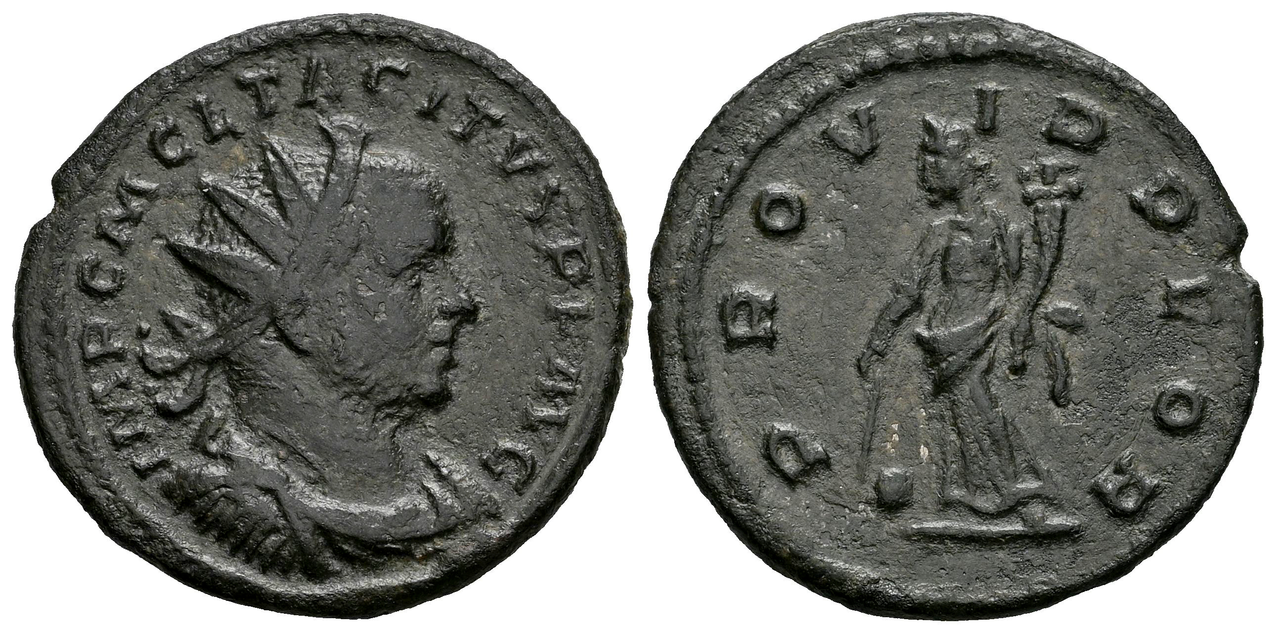 Tácito. Antoniniano. 275-276 d.C. Lugdunum. (Ric-V 1 48). (Tesorillo-Tácito 4, mismo ejemplar). Anv.: IMP C M CL TACITVS PF AVG. Busto radiado, drapeado y con coraza a la derecha. Rev.: PROVID DEOR, Providentia en pie a la izquierda, portando una vara y cornucopia; globo a sus pies. Ae. 3,71 g. MBC-/MBC. Est...40,00.