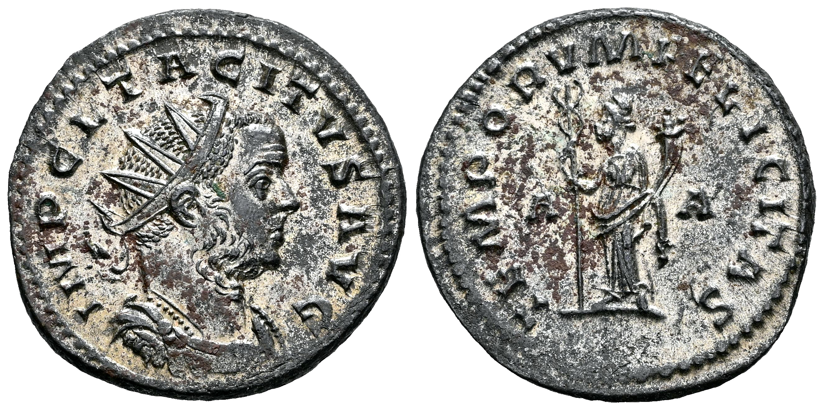 Tácito. Antoniniano. 276 d.C. Lugdunum. (Ric-V 1 65). (MER/RIC-3314). (Tesorillo-Tácito 6, mismo ejemplar). Anv.: IMP CL TACITVS AVG, Busto radiado, drapeado y con coraza a la derecha. Rev.: TEMPORVM FELICITAS, Felicitas en pie a la izquierda, portando un caduceo y cornucopia; Δ-A a través de los campos. Ve. 3,79 g. EBC. Est...60,00.