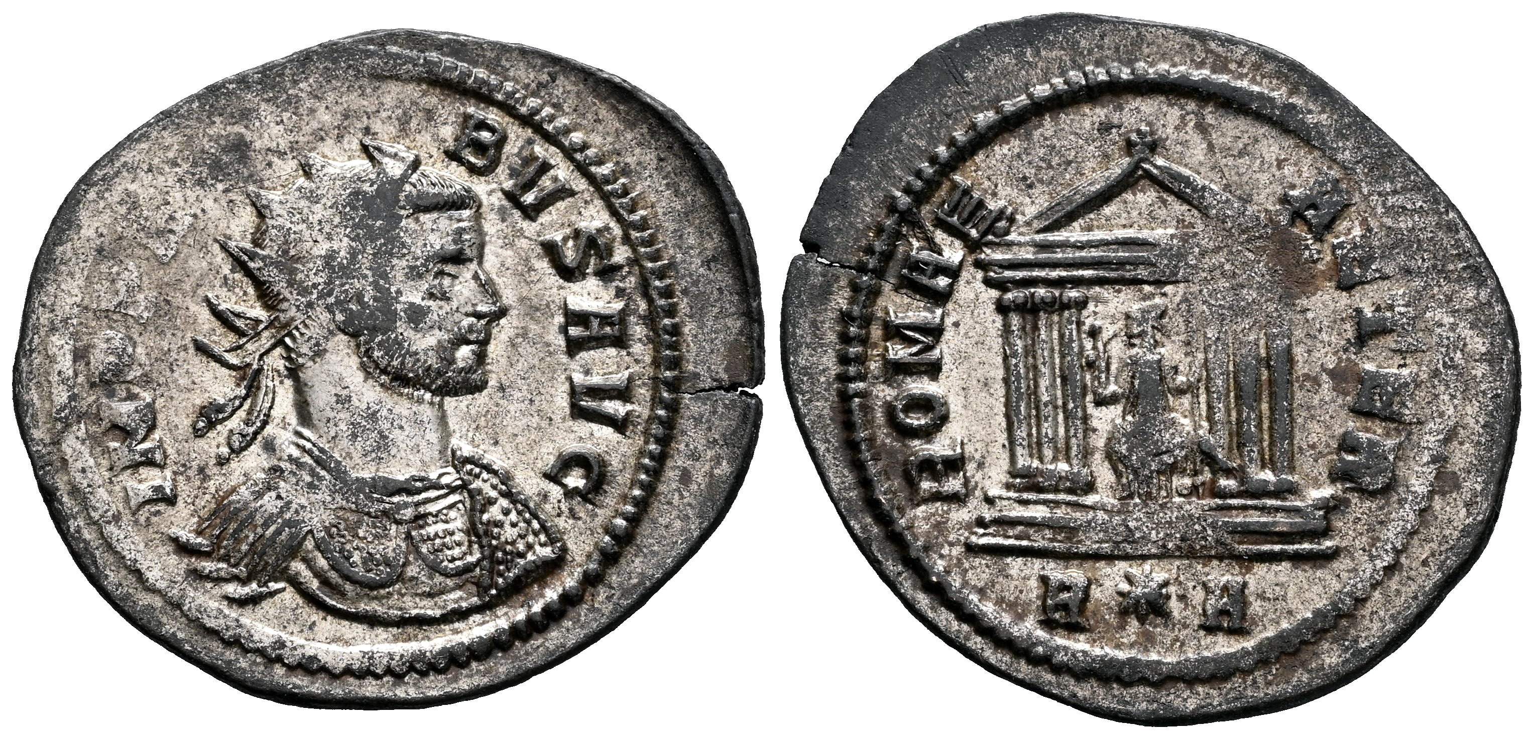 Probo. Antoniniano. 278 d.C. Roma. (Ric-V 2 185). (Tesorillo-Probo 24, mismo ejemplar). Anv.: IMP PROBVS AVG, Busto radiado, drapeado y con coraza a la derecha. Rev.: ROMAE AETER. Estatua de Roma sedente de frente en un templo de 6 columnas, portando Victoria y cetro; R (Estrella) A en exergo. Ve. 3,87 g. Leve vano de acuñación. Ex Ancient Delights, actualmente Mayor 25. Convención de Madrid (Febrero 2006). MBC+. Est...60,00.