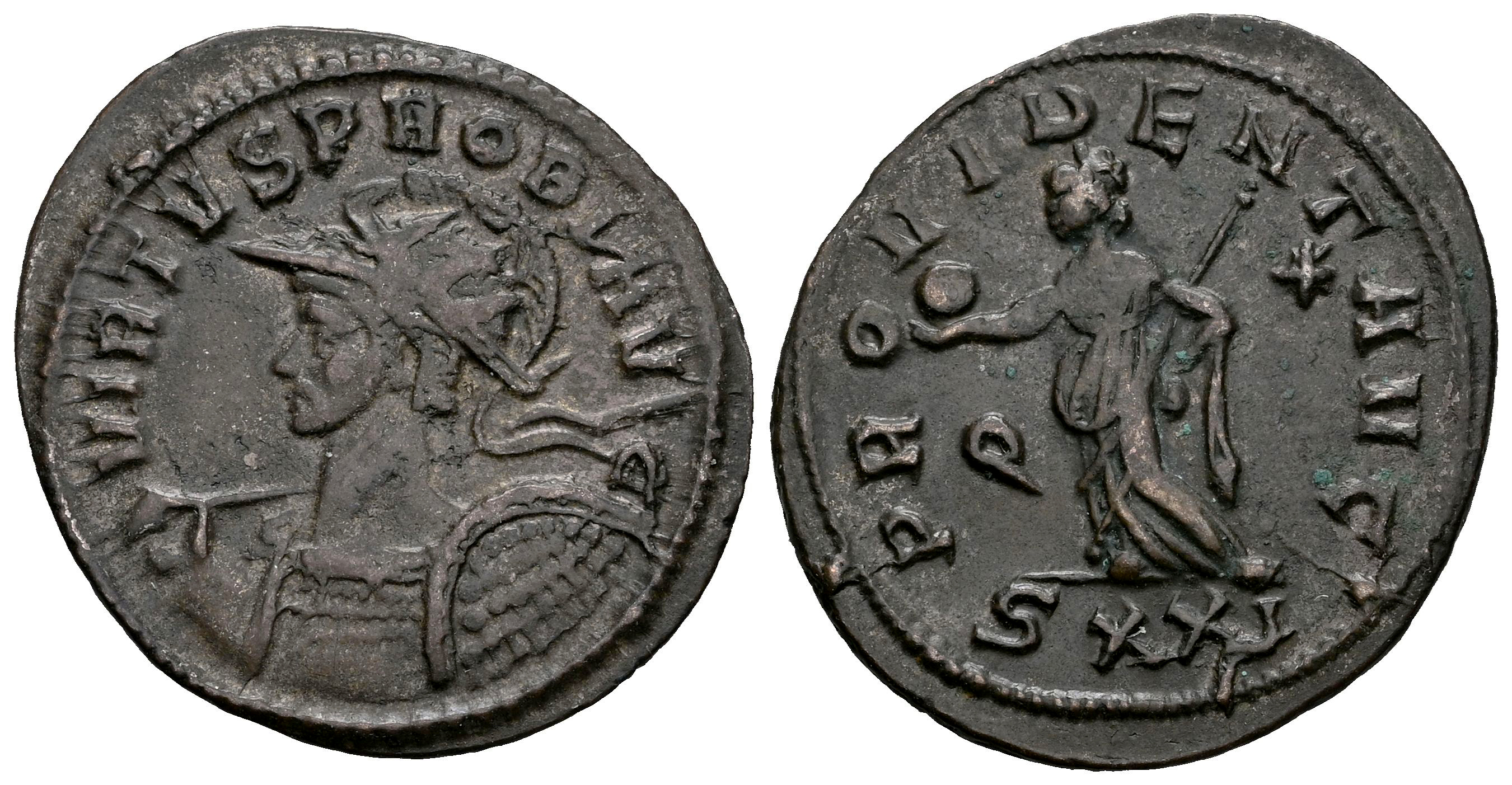 Probo. Antoniniano. 276-282 d.C. Ticinum. (Ric-V 2 491). (Tesorillo-Probo 18, mismo ejemplar). Anv.: VIRTVS PROBI AVG, Busto con casco, radiado y con coraza a la izquierda, portando lanza y escudo. Rev.: PROVIDENT AVG, Providentia en pie a la izquierda, portando globo y cetro; Q - Estrella a través de los campos, SXXI en exergo. Ae. 3,51 g. MBC. Est...50,00.
