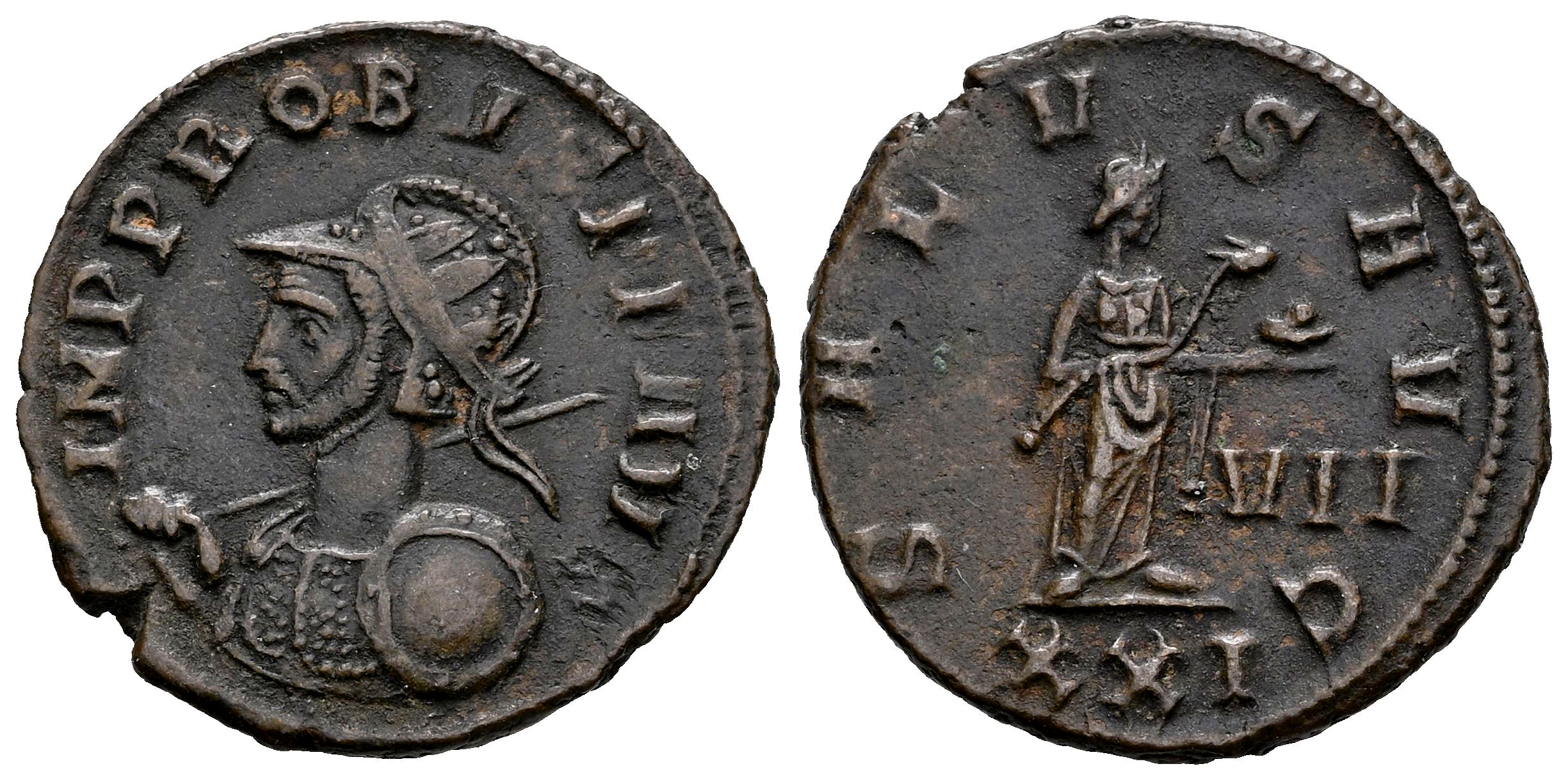 Probo. Antoniniano. 280 d.C. Siscia. (Ric-V 2 748 var.). (Tesorillo-Probo 26, mismo ejemplar). Anv.: IMP PROBVS P F AVG BUsto radiado, con casco y coraza a la izquierda, portando lanza en la mano derecha y escudo redondo (parma) en la izquierda. Rev.: SALVS AVG. Salus en pie a la derecha, alimentando una serpiente que sostiene en la mano derecha, utilizando una pátera que porta en la mano izquierda, VII en el campo derecho; XXI en exergo. Ve. 3,43 g. Rara. Ex Soler & Llach (14/05/2009), lote 3022. MBC/MBC+. Est...80,00.