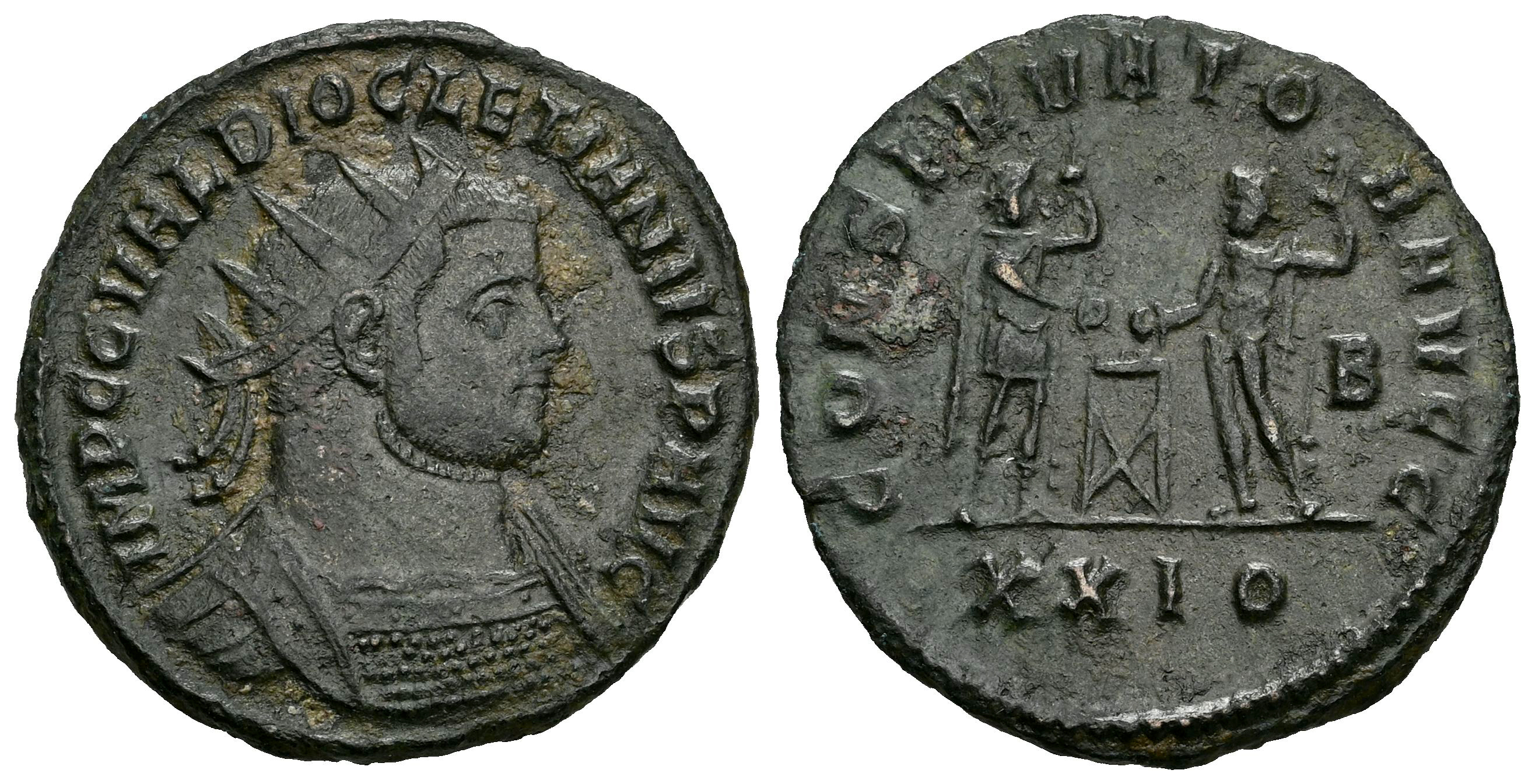 Diocleciano. Antoniniano. 284-305 d.C. Siscia. (Ric-V 2 263). (C-42). (Tesorillo-Diocleciano 12, mismo ejemplar). Anv.: IMP C C VAL DIOCLETIANVS P F AVG. Busto radiado y con coraza a la derecha. Rev.: CONSERVATOR AVGG. Emperador en pie hacia la derecha y Júpiter en pie hacia la izquierda, sacrificando en un altar situado entre ambos, B en el campo derecho; XXIO en exergo. Ve. 3,75 g. Ex Gert Boersema, Vcoins (Octubre 2010). MBC+. Est...60,00.