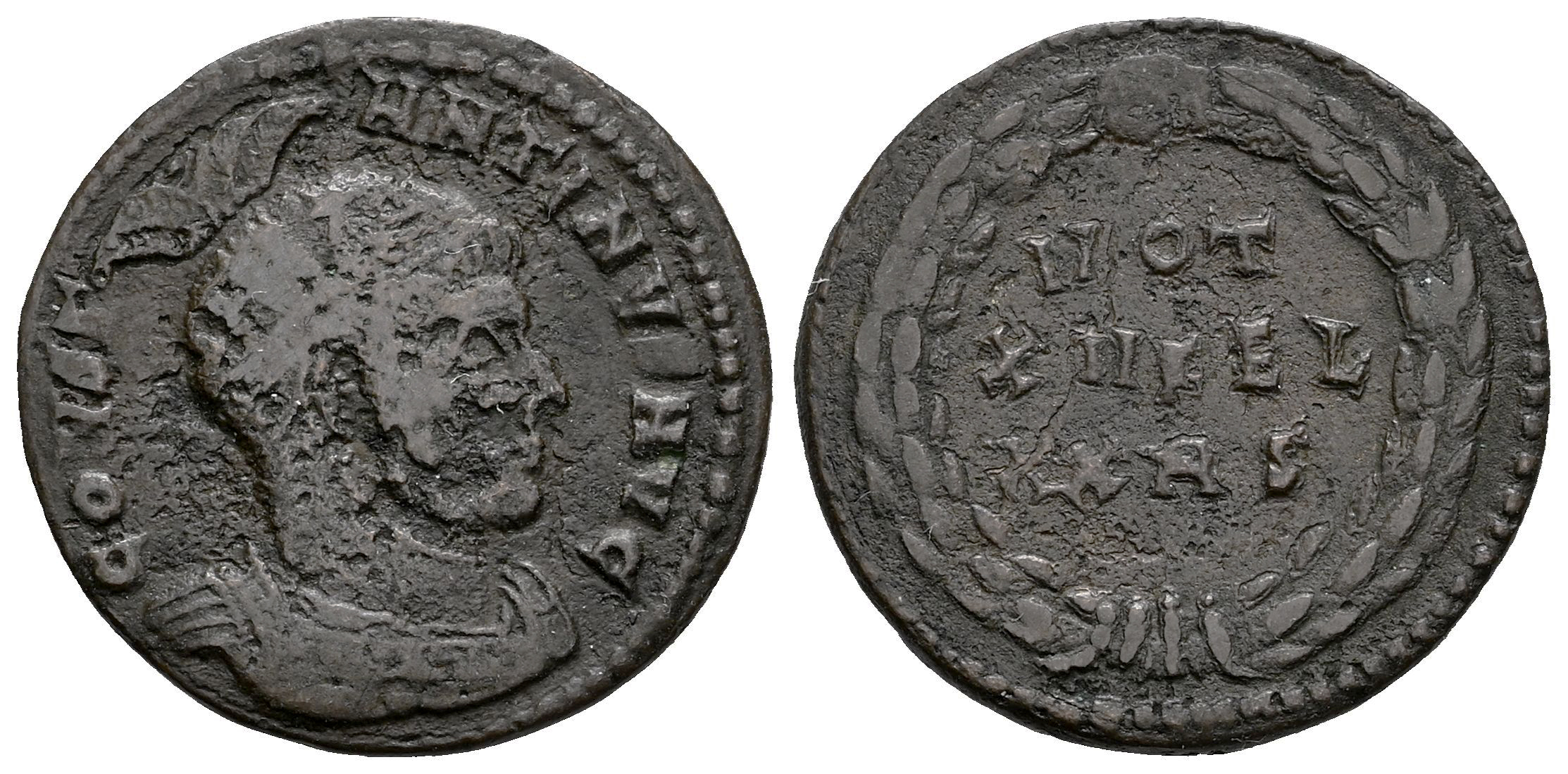 Constantino I. Follis. 320 d.C. Roma. (Ric-VII 220). (Tesorillo-Constantino I 133, mismo ejemplar). Anv.: CONSTANTINVS AVG. Busto con casco y coraza a la derecha. Rev.: VOT / XV FEL / XX R S en tres líneas dentro de corona. Ae. 2,55 g. Ex Soler & Llach (14/05/2009), lote 3022. BC+/MBC-. Est...80,00.