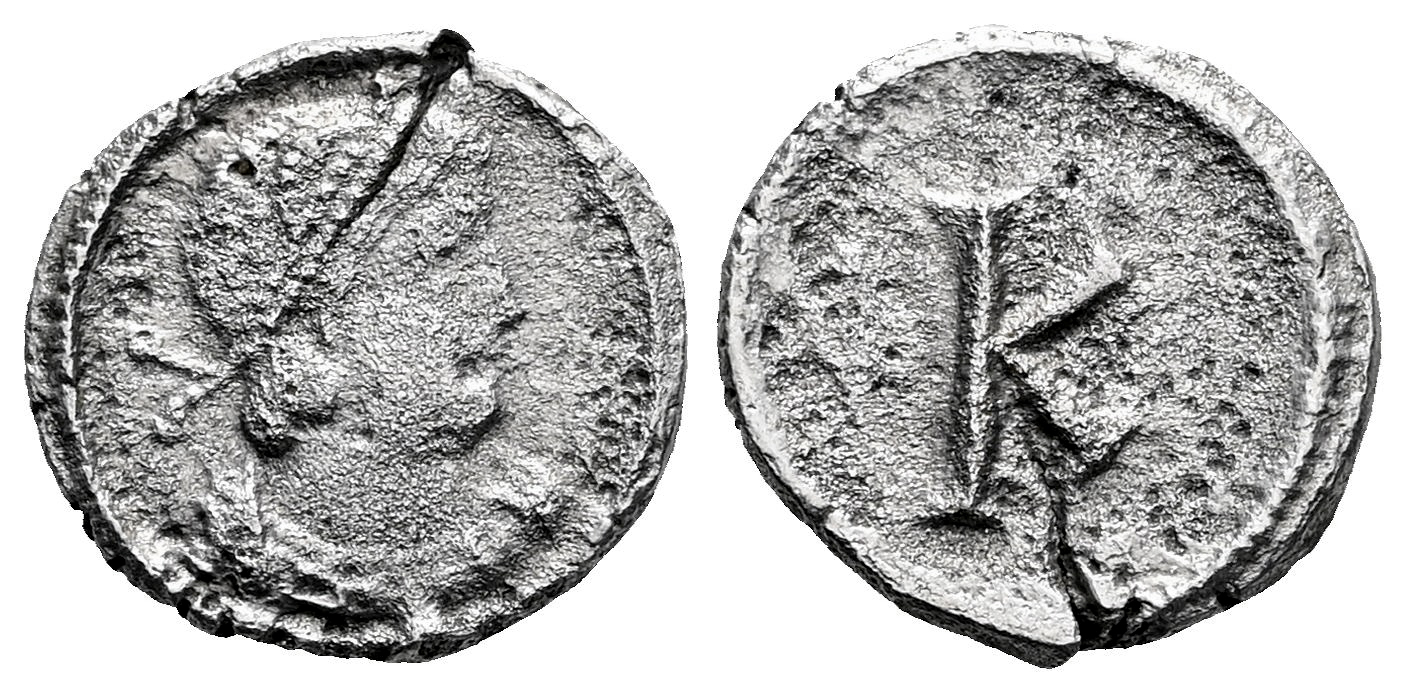 Constantino I. Series conmemorativas. 1/3 Silicua. 330 d.C. Constantinopla. (Bendall-Anonymous silver, RN 158 (2002), Type 4). (Cohen-287 Constantine II). (Tesorillo-Elena 1, mismo ejemplar). Anv.: Busto drapeado de Constantinopolis a la derecha, con diadema de perlas con extensión semicircular y collar de perlas; todo dentro de un círculo de puntos. Rev.: K grande dentro del círculo de puntos. Ag. 0,90 g. Muy rara. Metal algo poroso. Grieta. Ex Ancient Delights, actualmente Mayor 25. Convención de Madrid (Febrero 2006). BC+/MBC. Est...200,00.