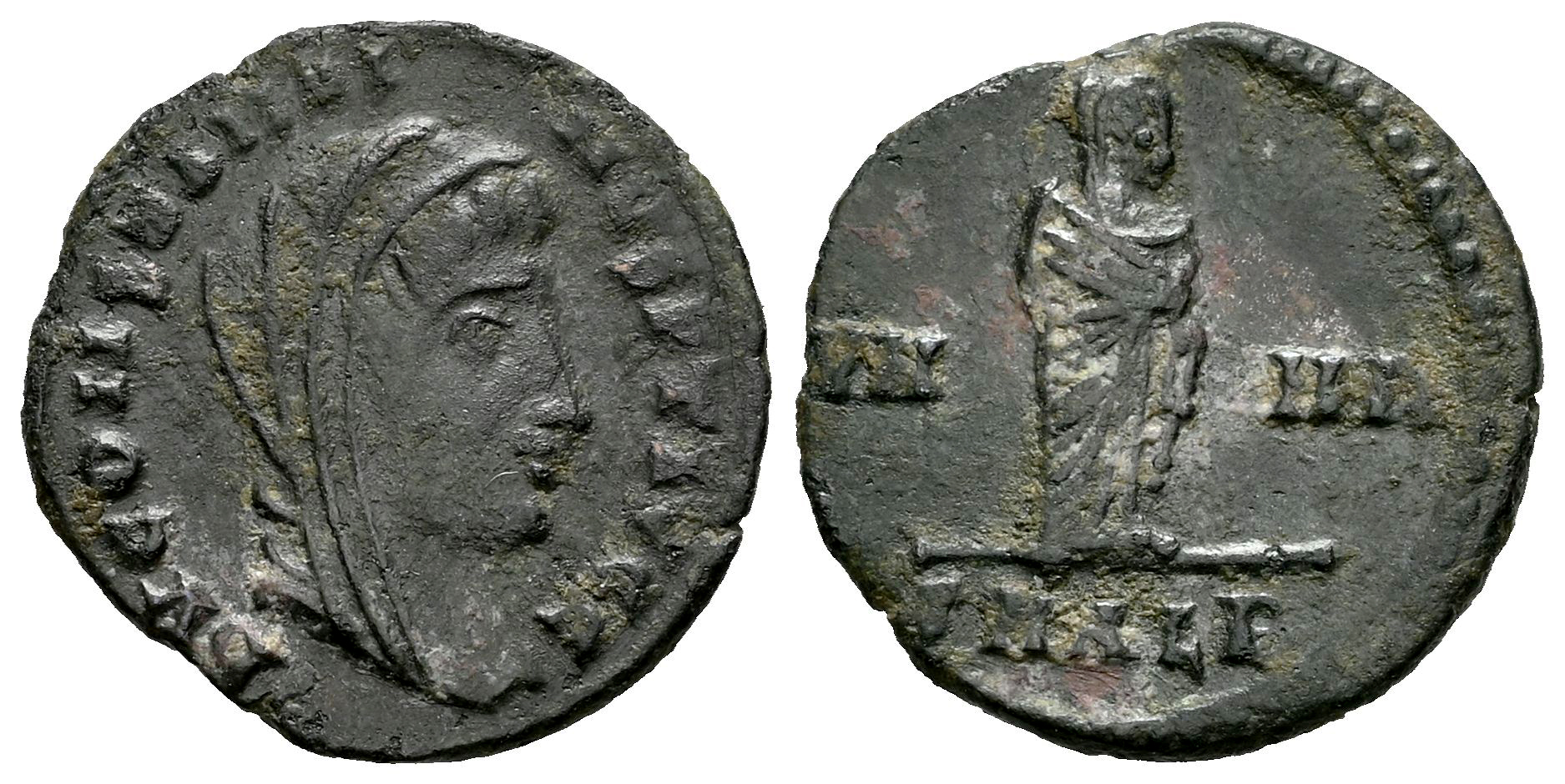 Divo Constantino I. Follis. 347-348 d.C. Alejandría. (Ric-VIII 32). (Tesorillo-Constantino I 128, mismo ejemplar). Anv.: D V CONSTANTINVS P T AVGG, Cabeza velada a la derecha. Rev.: Emperador deificado en pie a la derecha; VN-MR a través de los campos, SMALΓ en exergo. Ae. 1,62 g. MBC. Est...45,00.