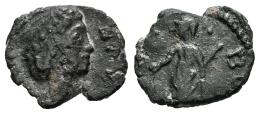 Helena. Follis. 324-328/30 d.C. Treveri?. (Ric-Tipo 63). (Tesorillo-Helena 5, mismo ejemplar). Anv.: (ELEN)A F V. Busto con diadema y drapeado a la derecha. Rev.: (PAX)• BO(NA).Pax en pie de frente, mirando a la izquierda, portando rama en su mano derecha; ¿T? en exergo. Ae. 0,69 g. Esta pequeña imitación contemporánea es excepcionalmente rara e intrigante. La leyenda del reverso dice PAX BONA, pero resulta muy improbable que fuera intencional. Originalmente, estaba basada en PAX PUBLICA, por lo que parece más probable que PAX BONA sea una interpretación errónea. Extremadamente rara. MBC. Est...100,00.