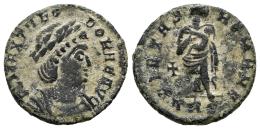 Theodora. Follis. 337-340 d.C. Treveri. (Ric-VIII 43). (Tesorillo-Teodora 2, mismo ejemplar). Anv.: FL MAX THEODORAE AVG, Busto laureado y drapeado a la derecha. Rev.: PIETAS ROMANA, Pietas en pie de frente, mirando a la derecha, llevando un niño; TRS en exergo. Ae. 1,50 g. MBC. Est...50,00.