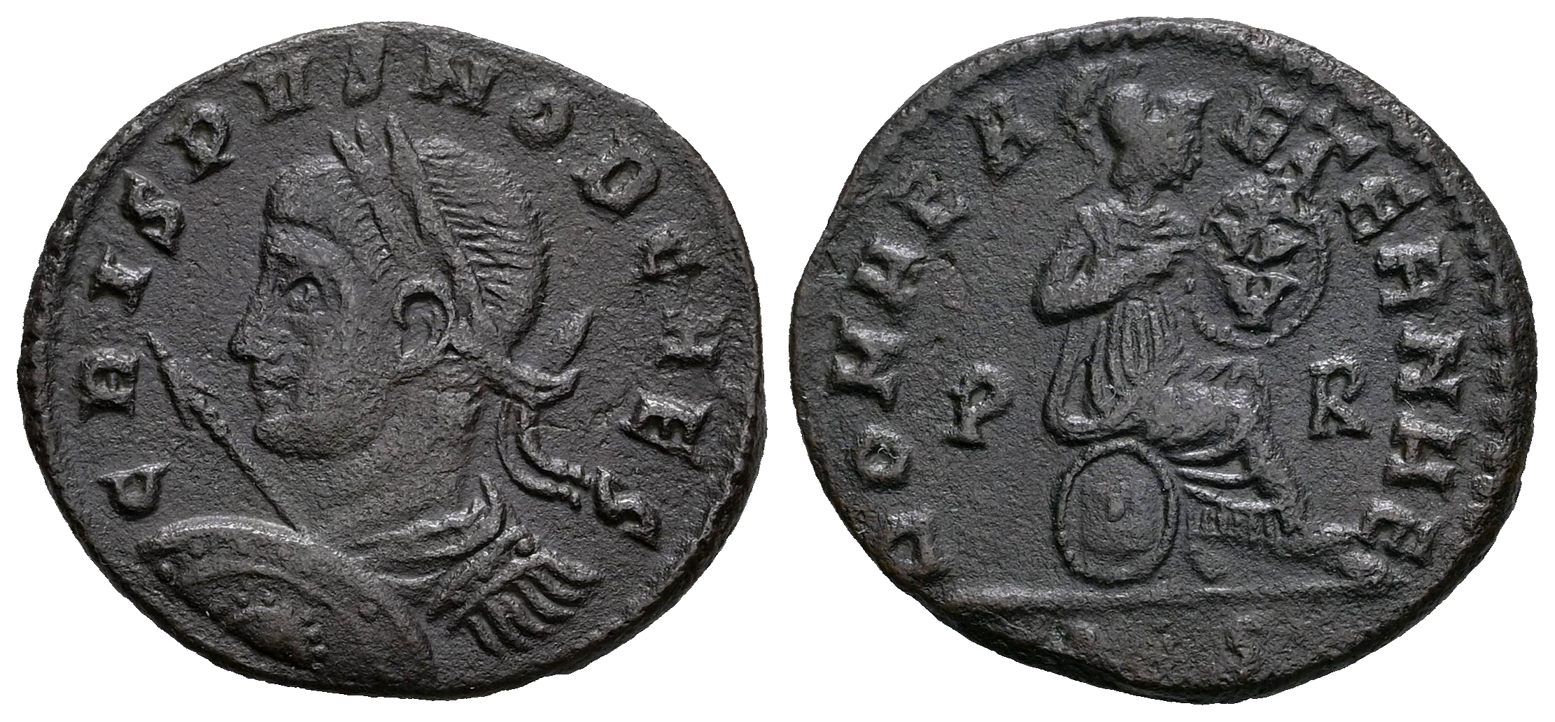 Crispo. Follis. 318-319 d.C. Roma. (Ric-VII 152). (Tesorillo-Crispo 22, mismo ejemplar). Anv.: CRISPVS NOB CAES, Busto laureado y con coraza a la izquierda, portando lanza y escudo. Rev.: ROMAE AETERNAE, Roma sedente a la derecha, inscribiendo XV en dos líneas sobre escudo; P-R a través de los campos, RS en exergo. Ae. 2,62 g. Rara. MBC. Est...45,00.
