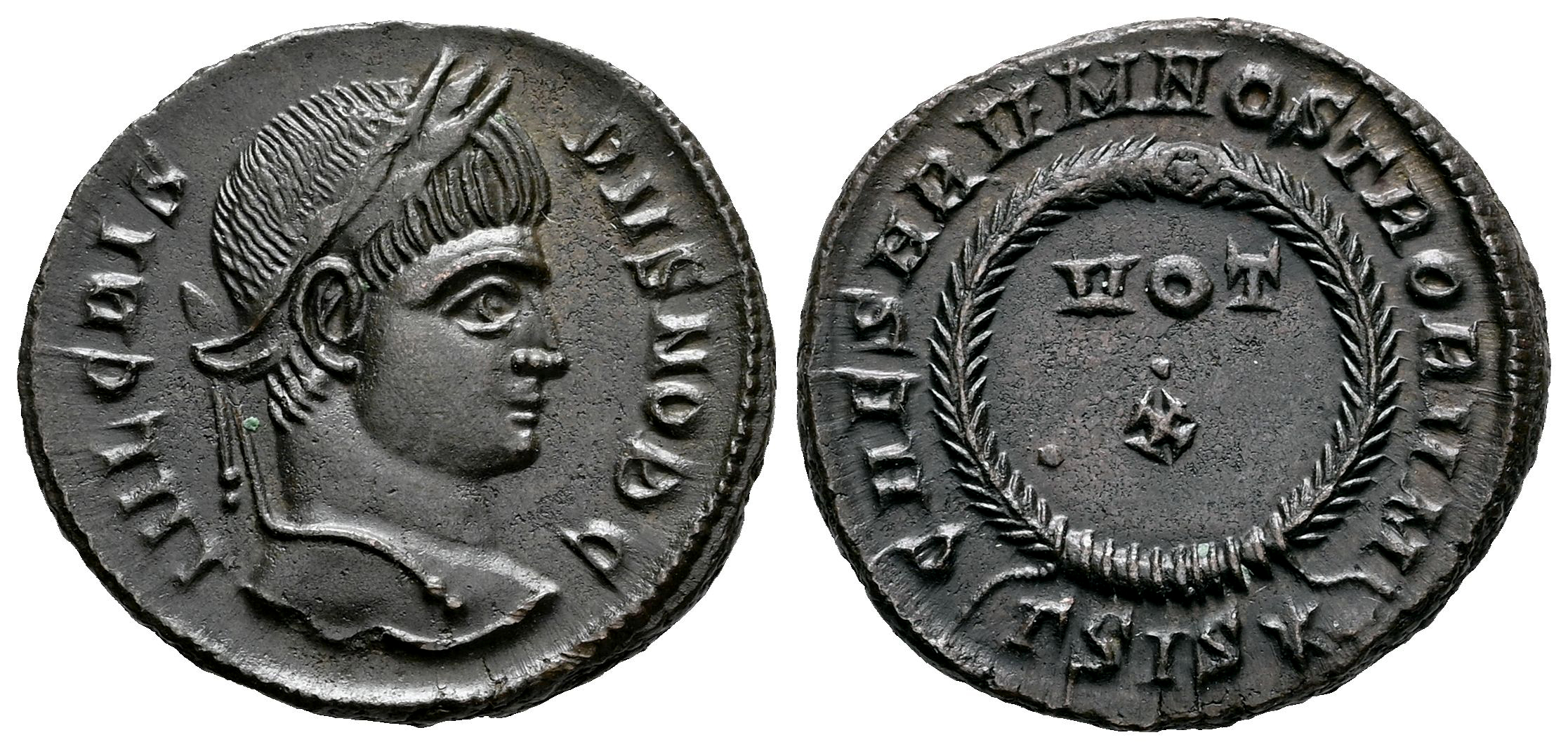 Crispo. Follis. 320-321 d.C. Siscia. (Ric-VII 165). (Tesorillo-Crispo 9, mismo ejemplar). Anv.: IVL CRISPVS NOB C, Cabeza laureada a la derecha. Rev.: CAESARVM NOSTRORVM, corona conteniendo VOT•V; ΓSIS(estrella) en exergo. Ae. 3,15 g. Precioso ejemplar. SC/SC-. Est...60,00.