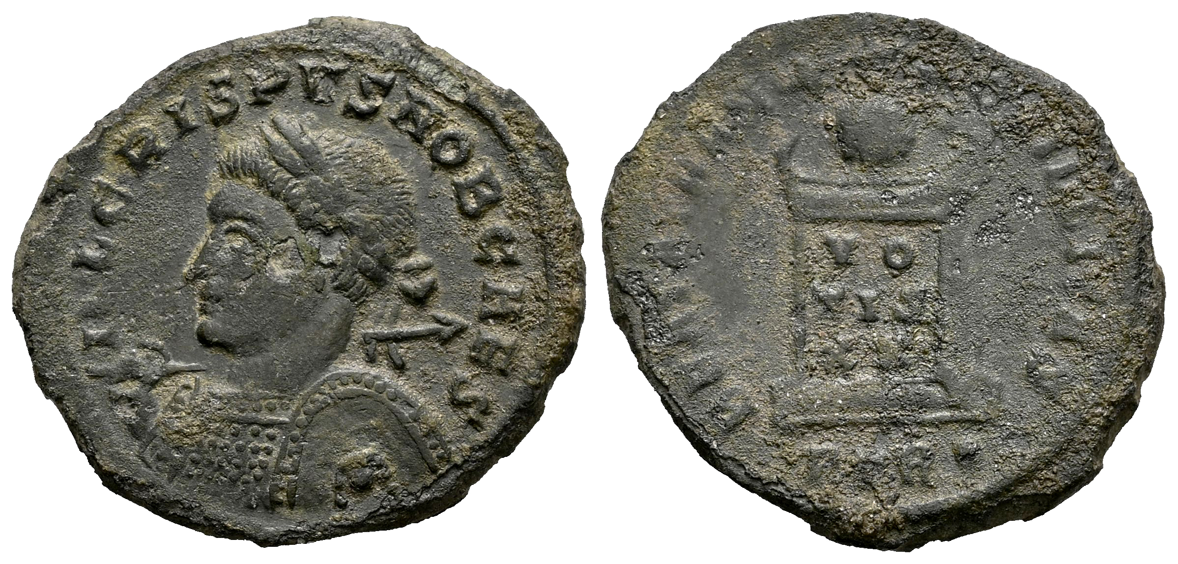 Crispo. Follis. 322 d.C. Treveri. (Ric-VII 347). (Tesorillo-Crispo 2, mismo ejemplar). Anv.: IVL CRISPVS NOB CAES, Busto laureado y con coraza a la izquierda, portando lanza y escudo. Rev.: BEATA TRANQVILLITAS, Globo con cintas colocado sobre un altar con la inscripción VOTIS XX en tres líneas; tres estrellas encima, PTR• en exergo. Ae. 2,29 g. MBC/MBC-. Est...30,00.