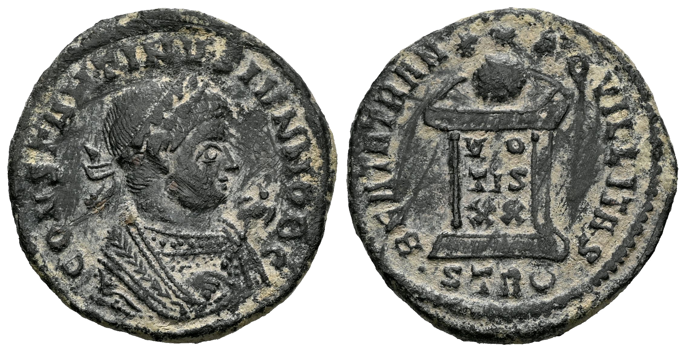 Constantino II. Follis. 323 d.C. Treveri. (Ric-VII 412). (Tesorillo-Constantino II 5, mismo ejemplar). Anv.: CONSTANTINVS IVN NOB C, Busto laureado a la derecha, vistiendo trabea y portando cetro rematado en águila. Rev.: BEATA TRANQVILLITAS, altar con inscripción VOTIS XX en tres líneas rematado por un globo con bandas; tres estrellas encima, •STR(creciente) en exergo. Ae. 2,96 g. MBC-/MBC. Est...45,00.