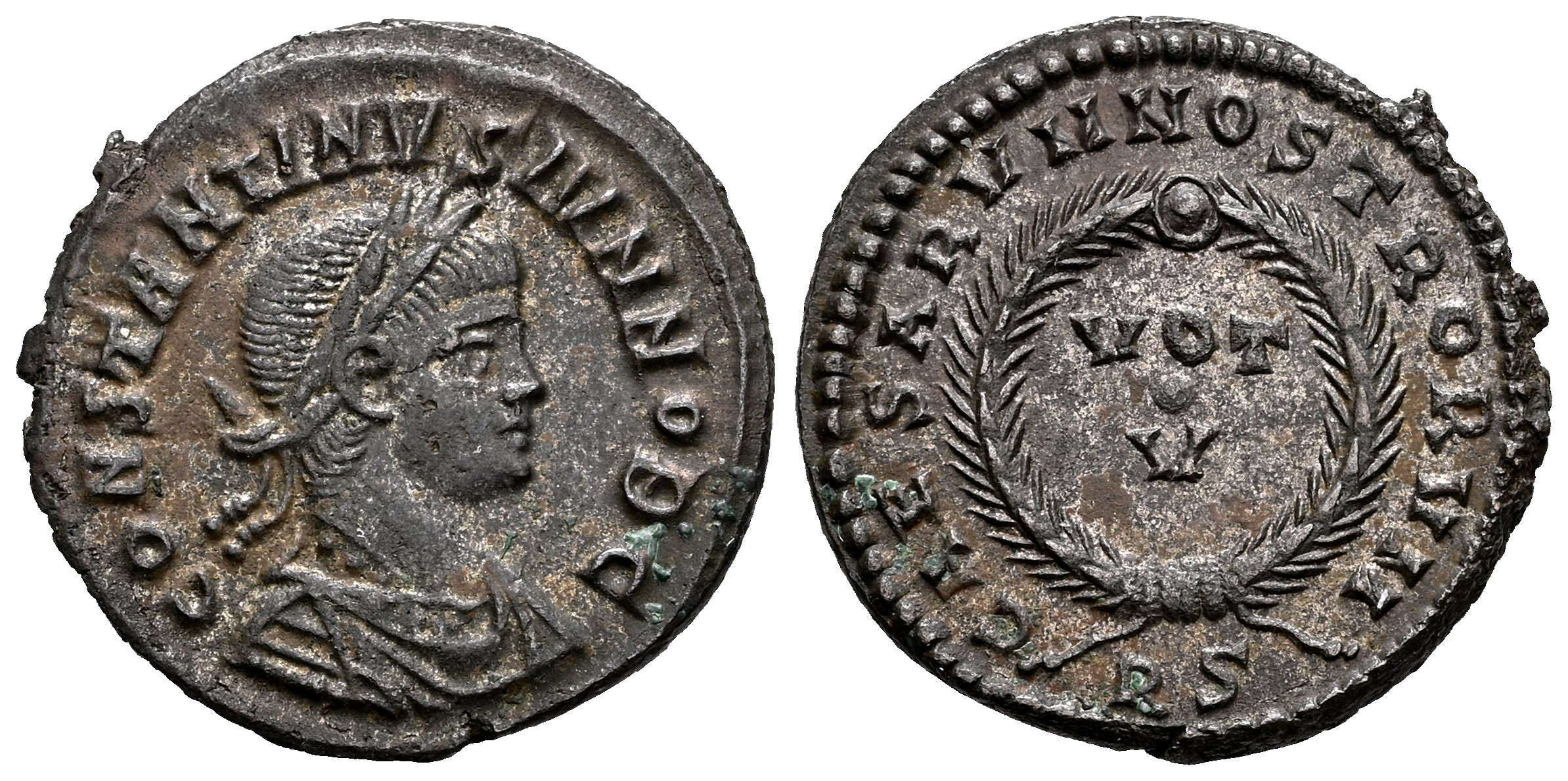 Constantino II. Follis. 321 d.C. Roma. (Ric-VII 236). (Tesorillo-Constantino II 9, mismo ejemplar). Anv.: CONSTANTINVS IVN NOB C, Busto laureado, drapeado y con coraza a la derecha. Rev.: CAESARVM NOSTRORVM, alrededor VOT • V en corona de laurel; RS en exergo. Ve. 3,32 g. MBC+/EBC. Est...50,00.