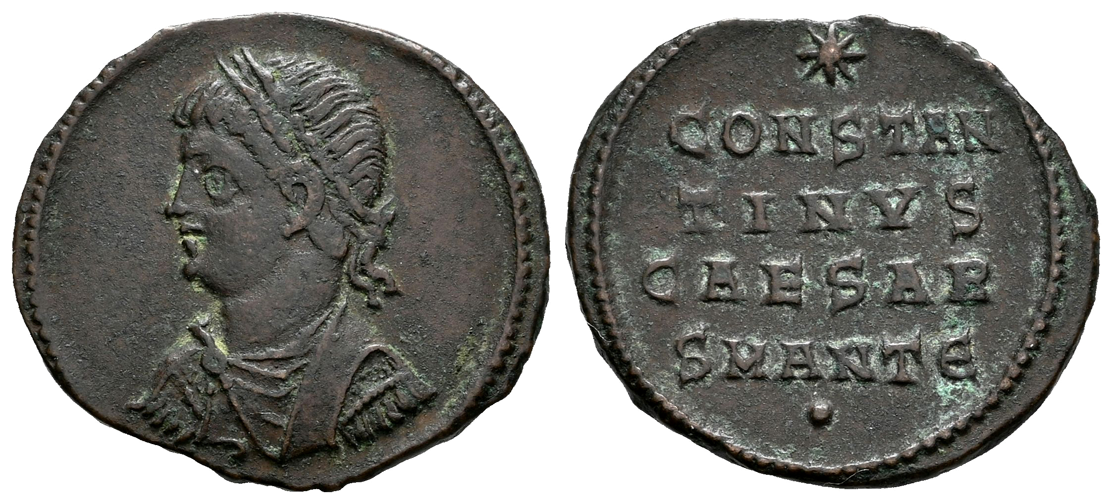 Constantino II. Follis. 325-326 d.C. Antioquía. (Ric-VII 59). (LRBC-1325). (Tesorillo-Constantino II 19, mismo ejemplar). Anv.: Busto laureado, drapeado y con coraza a la izquierda. Rev.: CONSTANTINVS CAESAR en tres líneas; estrella arriba, SMANTЄ y • debajo. Ae. 2,20 g. Rara. Ex Gert Boersema, Vcoins (Diciembre 2009). MBC+. Est...80,00.