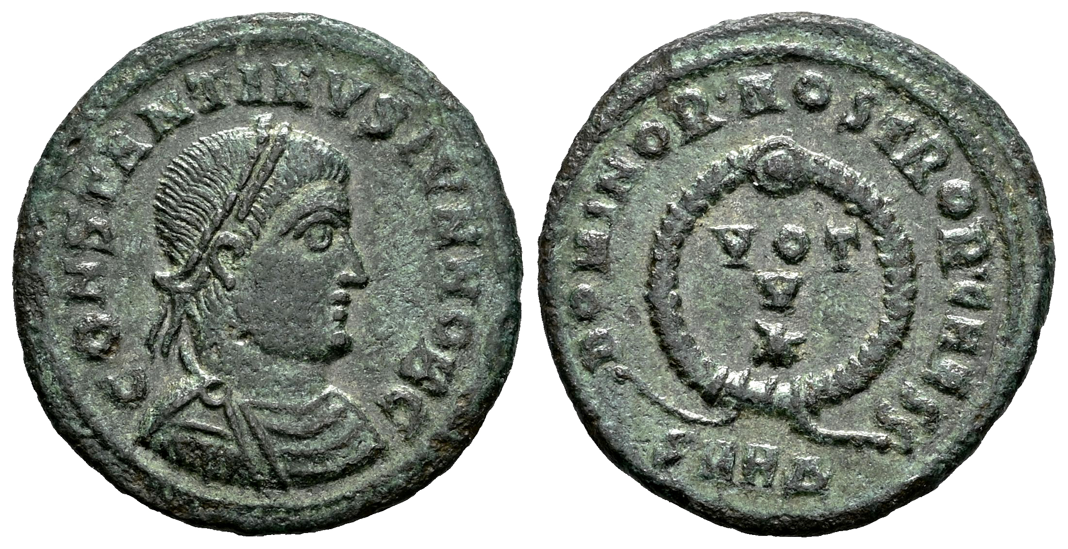 Constantino II. Follis. 324 d.C. Heraclea. (Ric-VII 63). (Tesorillo-Constantino II 22, mismo ejemplar). Anv.: CONSTANTINVS IVN NOB C, Busto laureado, drapeado y con coraza a la derecha. Rev.: DOMINOR NOSTROR CAESS, VOT V y estrella en tres líneas dentro de corona; SMHΔ en exergo. Ae. 2,88 g. Ex Ancient Delights, actualmente Mayor 25. (Marzo 2004). MBC+. Est...40,00.