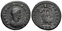 Constantino II. Follis. 319 d.C. Thessalonica. (Ric-VII 65). (Tesorillo-Constantino II 47, mismo ejemplar). Anv.: CONSTANTINVS IVN NOB C. Busto laureado, drapeado y con coraza a la derecha. Rev.: VICTORIA CAESS NN. Victoria avanzando a la izquierda, portando corona y palma frondosa •TS•B• en exergo. Ae. 3,52 g. Escasa. MBC-. Est...40,00.