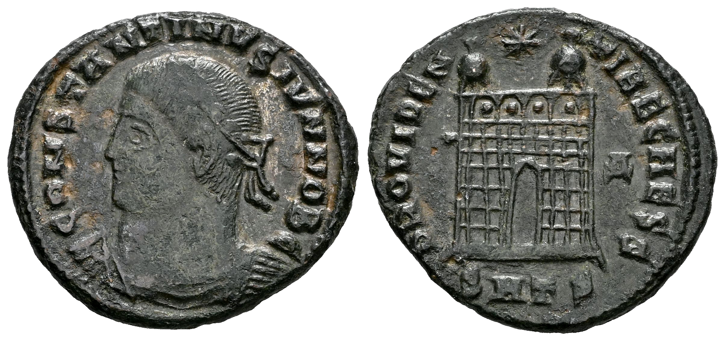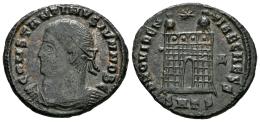 Constantino II. Follis. 328 d.C. Thessalonica. (Ric-VII 171). (Tesorillo-Constantino II 42, mismo ejemplar). Anv.: CONSTANTINVS IVN NOB C, Busto laureado, drapeado y con coraza a la izquierda. Rev.: PROVIDENTIAE CAESS, Puerta de campamento con siete filas de sillares, sin puertas y dos torretas; estrella arriba, Δ en el campo derecho, SMTS en exergo. Ae. 3,38 g. Muy rara. MBC-/MBC+. Est...50,00.