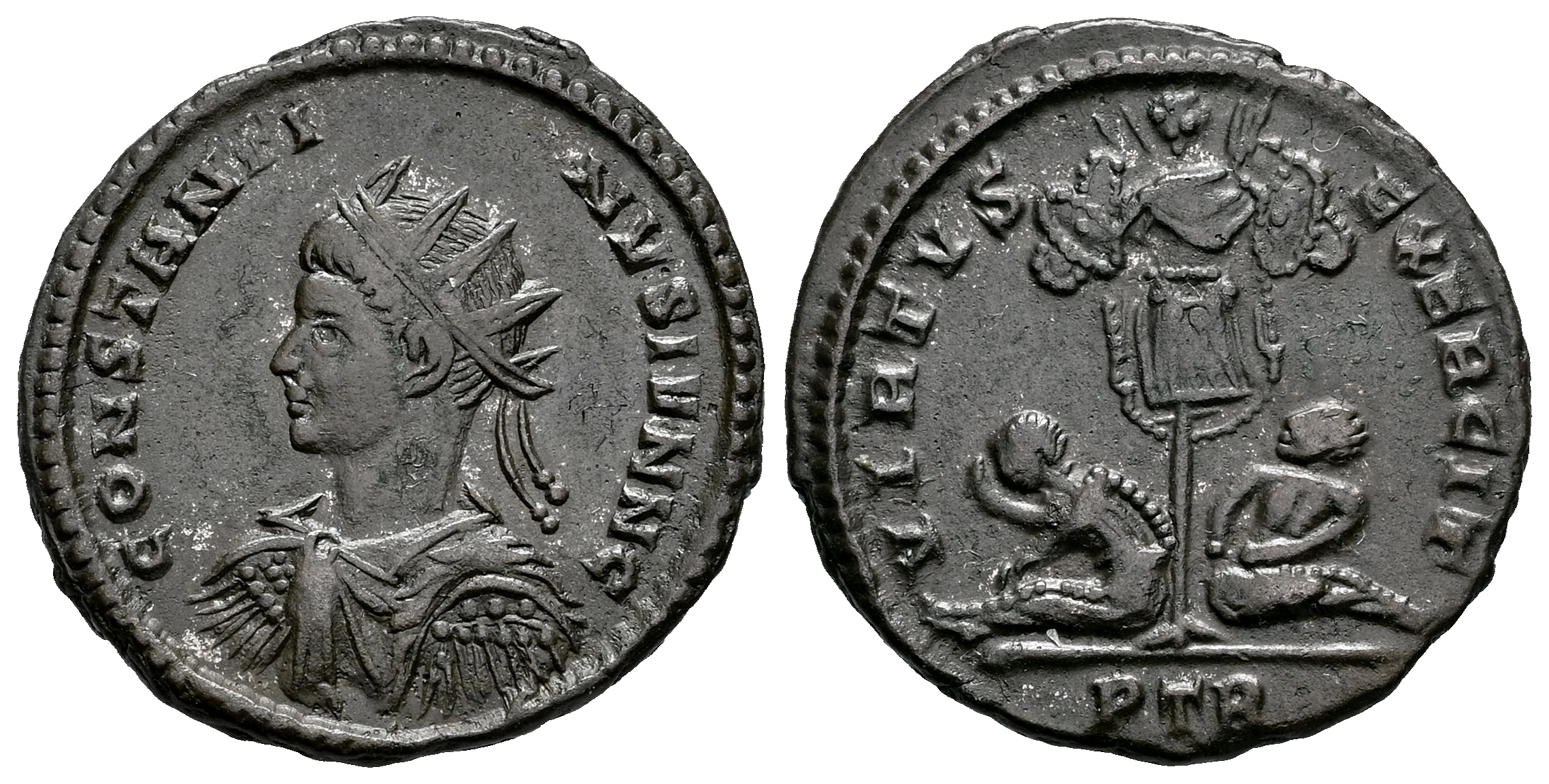 Constantino II. Follis. 320 d.C. Treveri. (Ric-No cita). (Tesorillo-Constantino II 59, mismo ejemplar). Anv.: CONSTANTINVS IVN N C. Busto radiado, drapeado y con coraza a la izquierda. Rev.: VIRTVS EXERCIT. Trofeo entre dos cautivos sedentes; PTR en exergo. Ae. 3,13 g. Muy rara. Not in RIC - Notes 3, mismo ejemplar. Ex Beast Coins - Z5529, Vcoins (Septiembre 2007). Conserva la etiqueta original. MBC+/EBC-. Est...150,00.