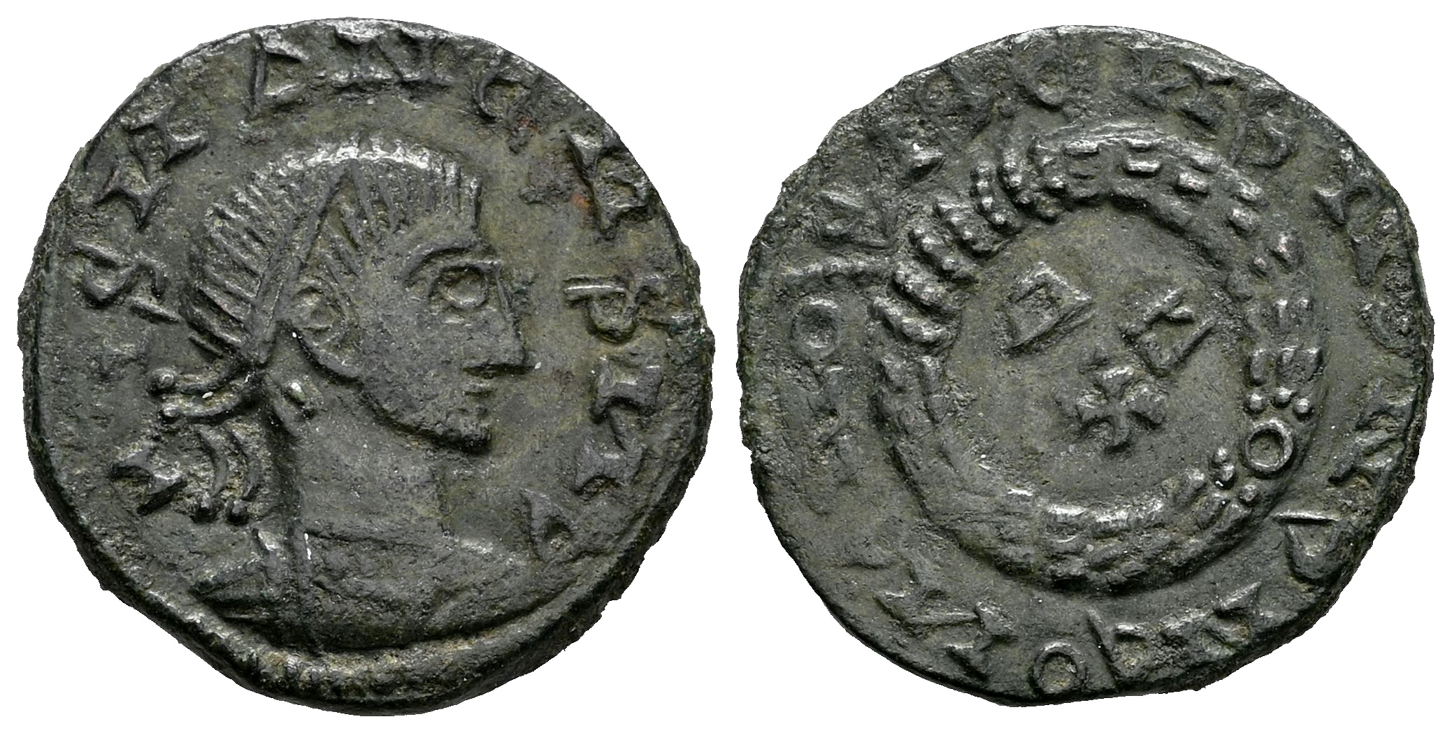 Constantino II. Follis. Siglo IV d.C. Siscia. Imitación Bárbara. (Tesorillo-Constantino II 14, mismo ejemplar). Anv.: Leyenda desacertada, Busto laureado, drapeado y con coraza a la derecha. Rev.: Leyenda desacertada, X/ VV en dos líneas dentro de corona; ¿B/A?SI en exergo. Ae. 2,73 g. Ex Nemesis - 8208, Vcoins (Julio 2008). Conserva la etiqueta original. MBC/MBC+. Est...50,00.