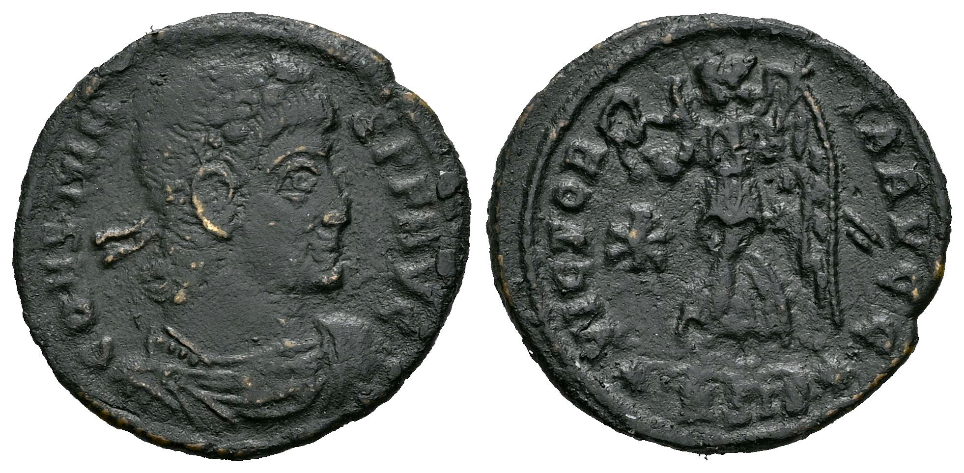 Constans. Centenional. 337-350 d.C. Siscia. (Ric-VIII 177). (C-127). (Tesorillo-Constante 31, mismo ejemplar). Anv.: CONSTANS P F AVG. Busto con diadema, drapeado y con coraza a la derecha. Rev.: VICTORIA AVGG. Victoria avanzando a la izquierda, portando corona y hoja de palma, Cristograma a la izquierda; *ASIS* en exergo. Ae. 1,36 g. MBC-/MBC. Est...30,00.