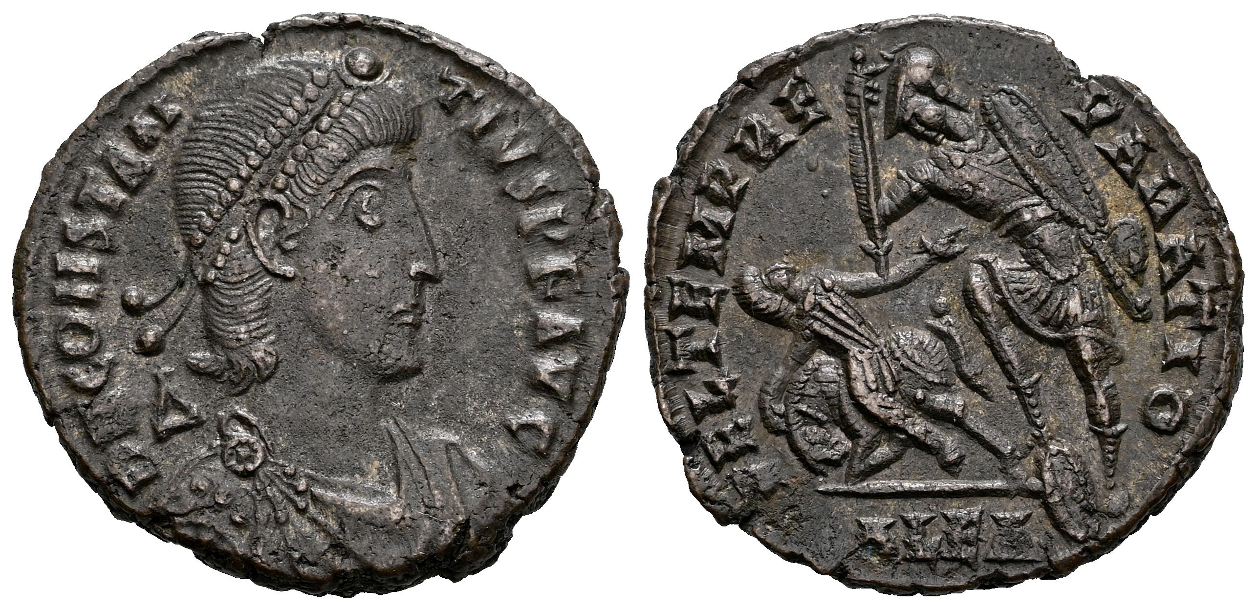 Constancio II. Centenional. 351-355 d.C. Alejandría. (Ric-VIII 75). (Tesorillo-Constancio II 20, mismo ejemplar). Anv.: D N CONSTANTIVS P F AVG. Busto con diadema de perlas, drapeado y coraza a la derecha; Δ detrás. Rev.: FEL TEMP REPARATIO. Soldado con casco a la izquierda, lancenando a un jinete caído; ALEA en exergo. Ae. 4,89 g. Ex William M. Rosenblum, Vcoins (Febrero 2006). Conserva la etiqueta original. MBC+. Est...50,00.