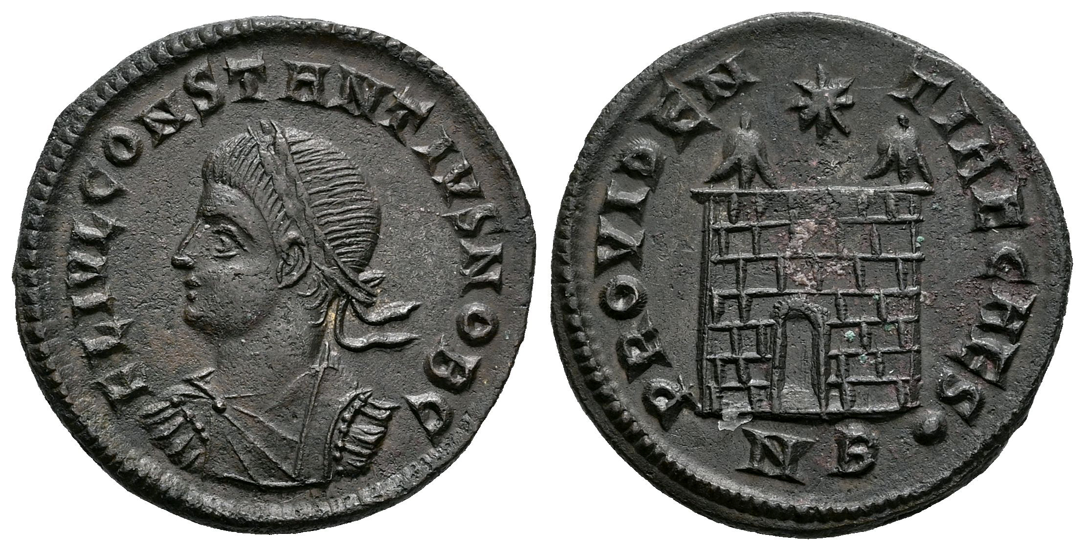 Constancio II. Follis. 326-327 d.C. Nicomedia. (Ric-VIII 147). (Tesorillo-Constancio II 5, mismo ejemplar). Anv.: FL IVL CONSTANTIVS NOB C, Busto laureado, drapeado y con coraza a la izquierda. Rev.: PROVIDENTIAE CAES•, puerta de campamento con siete niveles de sillares, sin puertas y dos torres; estrella arriba, NB en exergo. Ae. 2,89 g. Ex A. Tkalec (Septiembre 2010). EBC-/EBC. Est...50,00.