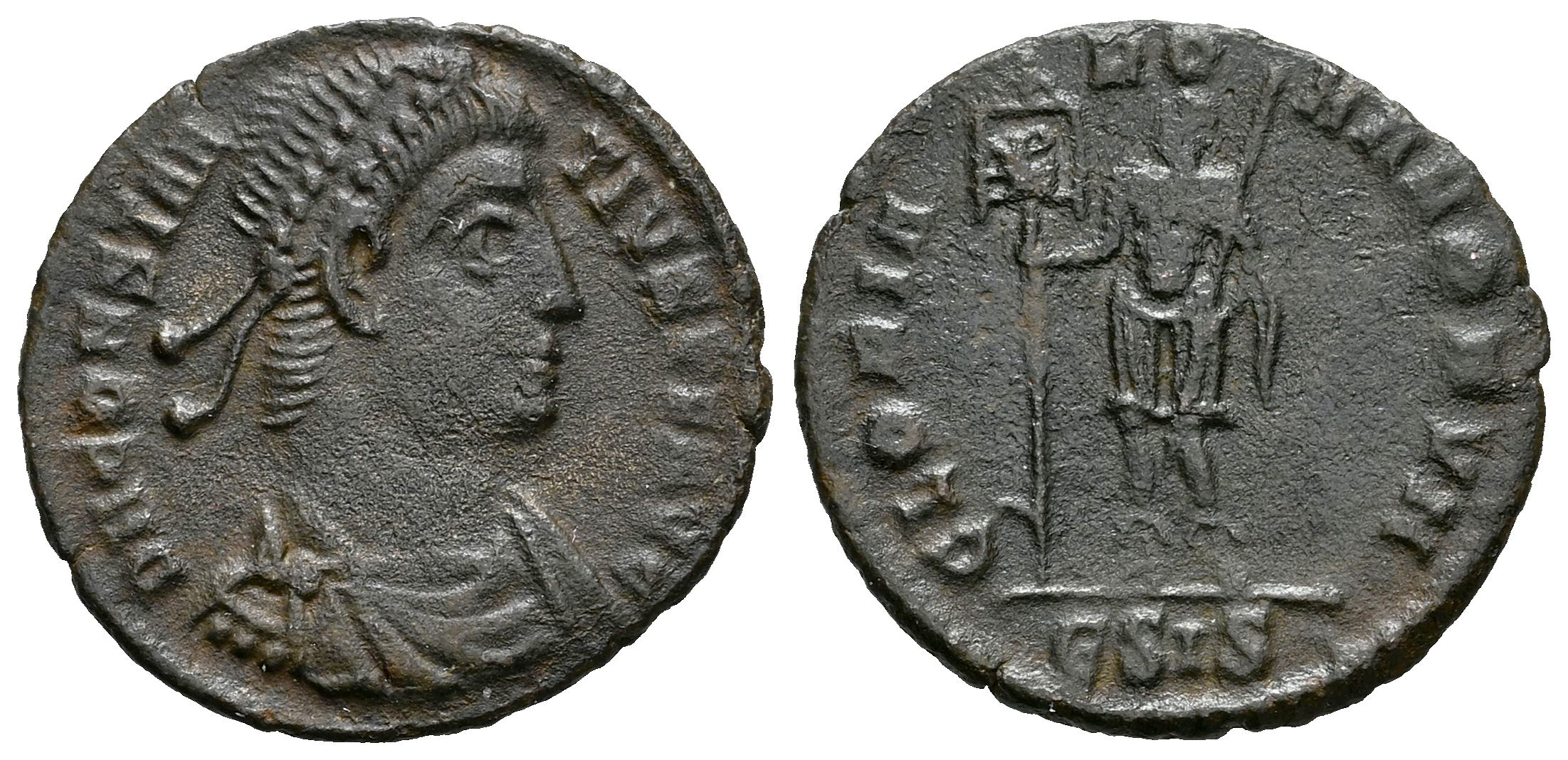 Constancio II. Follis. 350 d.C. Siscia. (Ric-VIII 293). (Tesorillo-Constancio II 55, mismo ejemplar). Anv.: D N CONSTANTIVS P F AVG, Busto con diadema de perlas, drapeado y con coraza a la derecha. Rev.: GLORIA ROMANORVM, Emperador en pie a la izquierda, portando estandarte con Crismón y lanza; ЄSIS en exergo. Ae. 1,88 g. Escasa. Ex Gert Boersema, Vcoins (Marzo 2012). MBC/MBC-. Est...50,00.